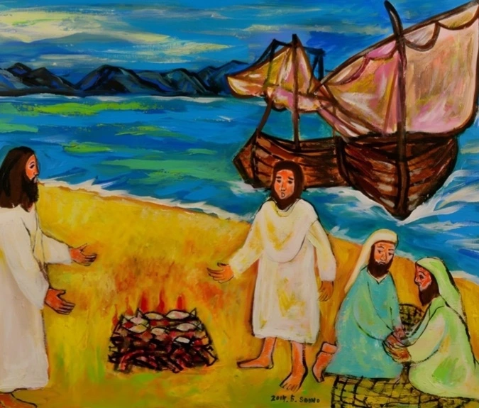 예수님이 잡은 고기를 조금 가져오라 하시고 숯불에 구워 조반을 먹을 수 있도록 해주신다.
