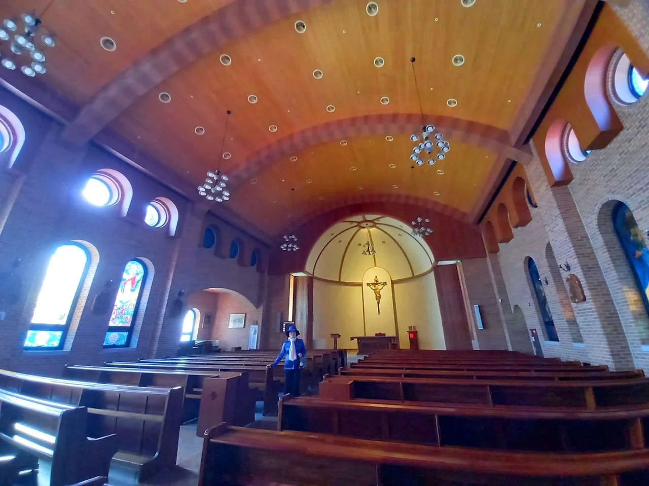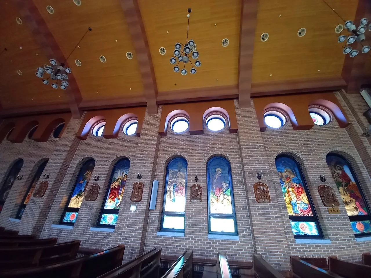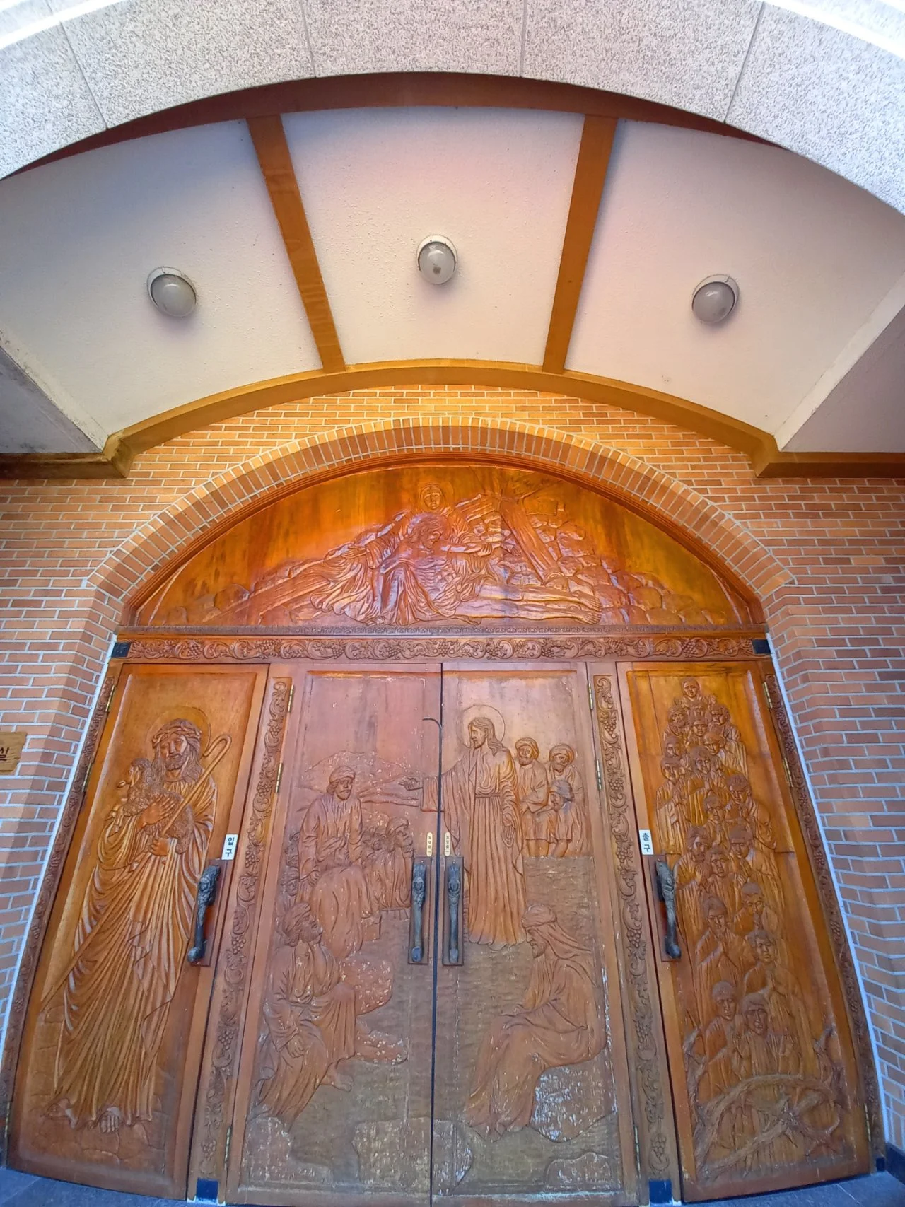 연풍성지에 있는 성당으로 들어가 본다. 두세 사람이 의자에 앉아서 경건하게 기도를 하고 있다. 우리는 조용히 들어가서 예배당 앞 쪽 예수님 십자가상과 설교단, 양쪽 벽면의 아름다운 아치형 모자이크 스테인드 글라스, 출입문에 새겨진 부조 성화 앞에서 기념샷을 남긴다. 예수님의 십자가와 부활 장면이 출입문에 새겨져 있다. 참 아름답다.