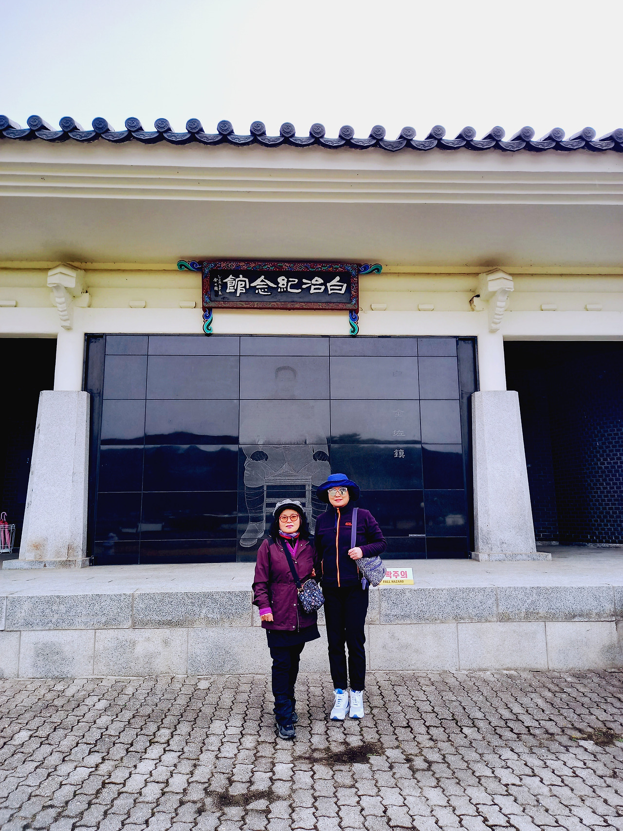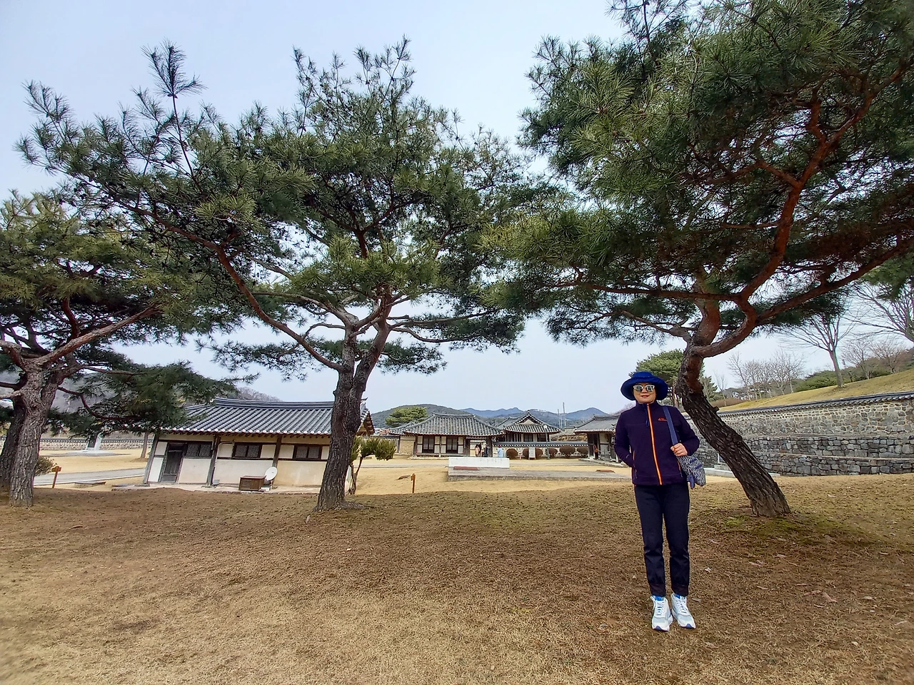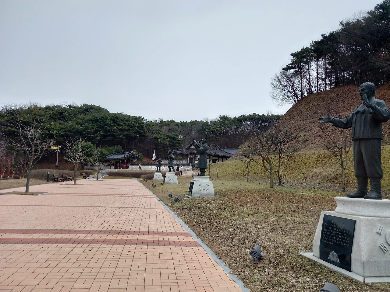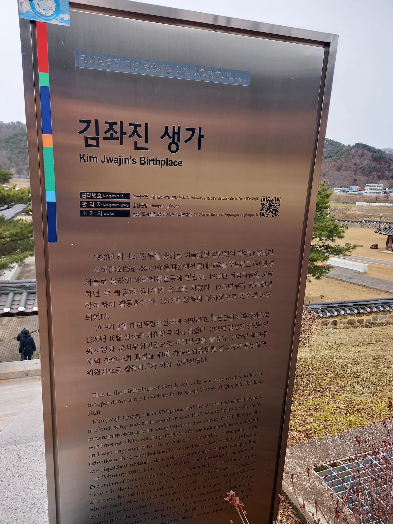 황금 부조 독립운동 장면과 태극기 앞에서 기념샷을 남기고 백야기념관 밖으로 나온다. 소나무 두 그루가 서 있는 곳에 올라 생가 전체를 배경으로도 서본다. 자주 와보고 싶은 곳이다.