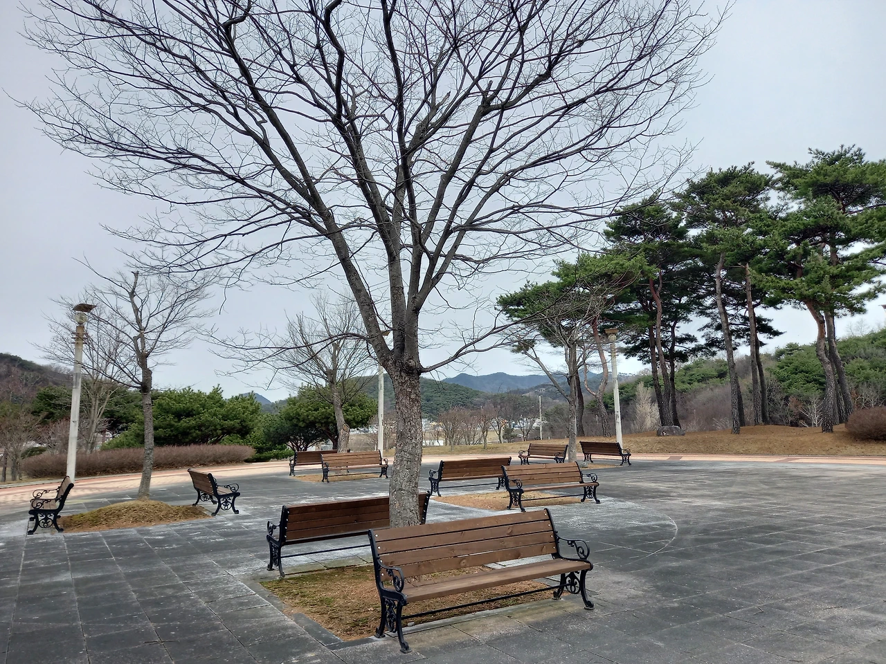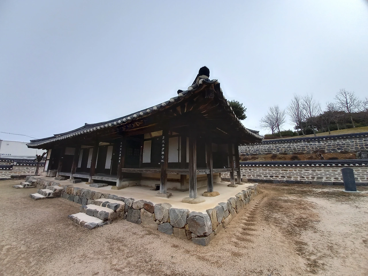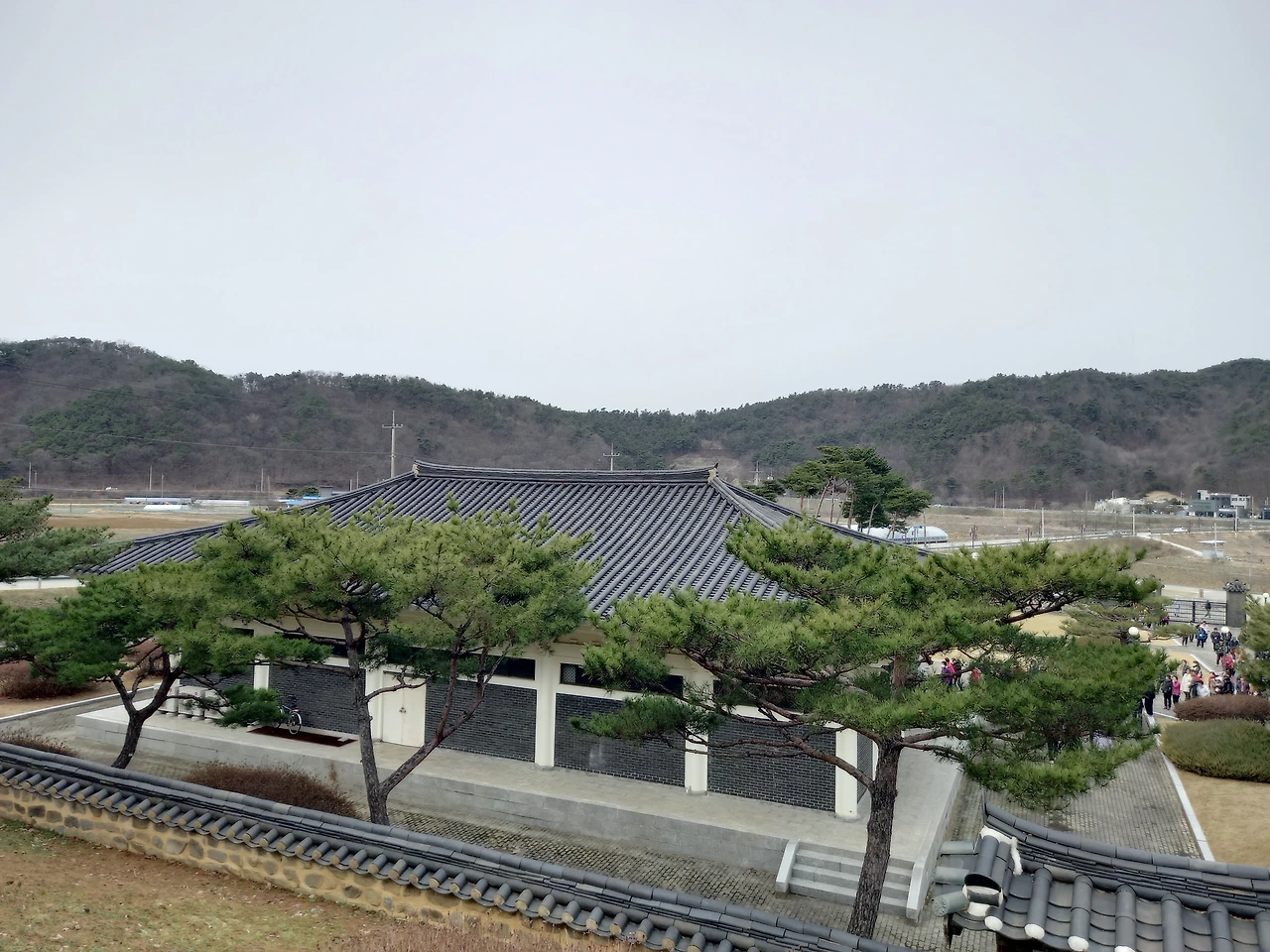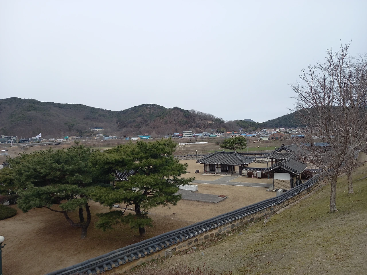 황금 부조 독립운동 장면과 태극기 앞에서 기념샷을 남기고 백야기념관 밖으로 나온다. 소나무 두 그루가 서 있는 곳에 올라 생가 전체를 배경으로도 서본다. 자주 와보고 싶은 곳이다.