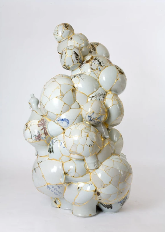 이수경 작가의 <번역된 도자기> 작품은 새하얀 옷을 입은 아기 같기도 하고, 하얀 눈사람 같기도 하다. 깨진 도자기를 에폭시로 붙이고 그 위에 금박을 입혀서 새로운 빛나는 예술작품으로 만든 것이다.