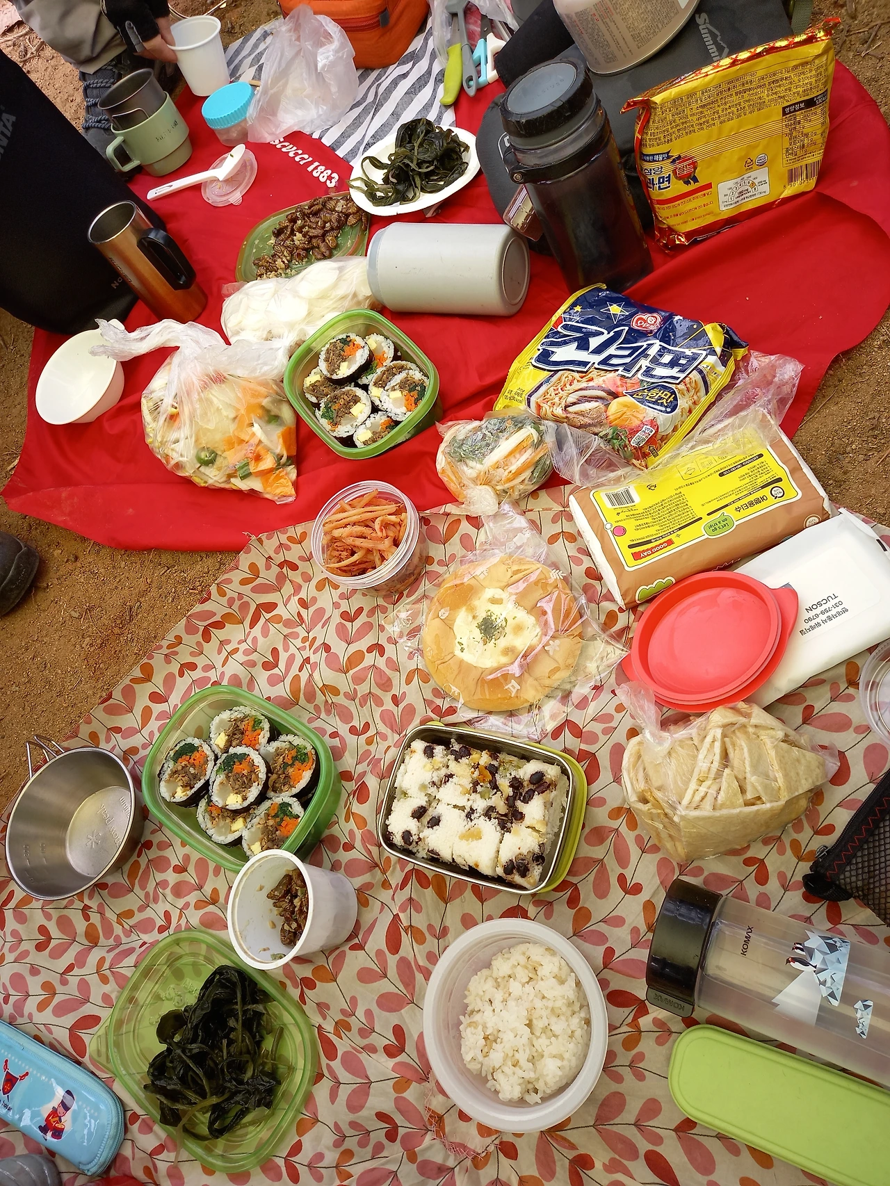 점심은 진달래 능선 중간쯤에 평평한 터를 잡아 돗자리와 타프를 치고 빙 둘러앉아서 먹는다. 늘 그렇듯이 서우님표 어묵에 콩나물, 말뫼님표 떡국떡, 세브란스님표 냉이까지 더해져 향긋함이 진해진다. 산이랑님 명품김밥에다. 번데기, 오징볶음, 빵, 영양밥, 떡까지 아주 푸짐하다. 후식으로는 온갖 커피를 섞어서 라테를 만들어 먹는다. 어느 커피점에서도 맛볼 수 없는 특별한 맛이다. 바로 수도산 인테리어커피다.