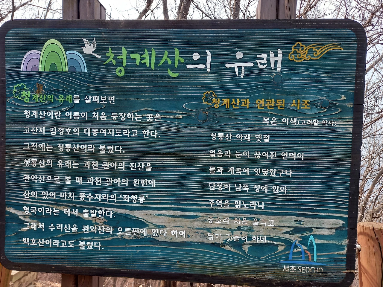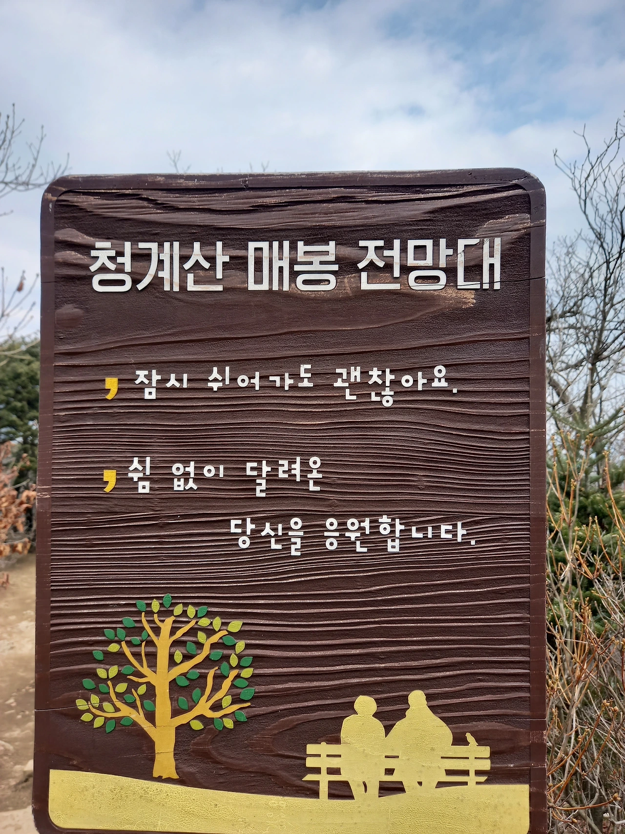 청계산 매봉 전망대라는 나무판에 "쉬어가도 괜찮아요. 쉼 없이 달려온 당신을 응원합니다."라는 글귀가 쓰여 있다. 정상에 서는 일은 쉼 없이 오를 때 가능한 것이다. 글귀를 단지 한번 읽어보는 것만으로도 힘을 얻고 하산을 시작한다.