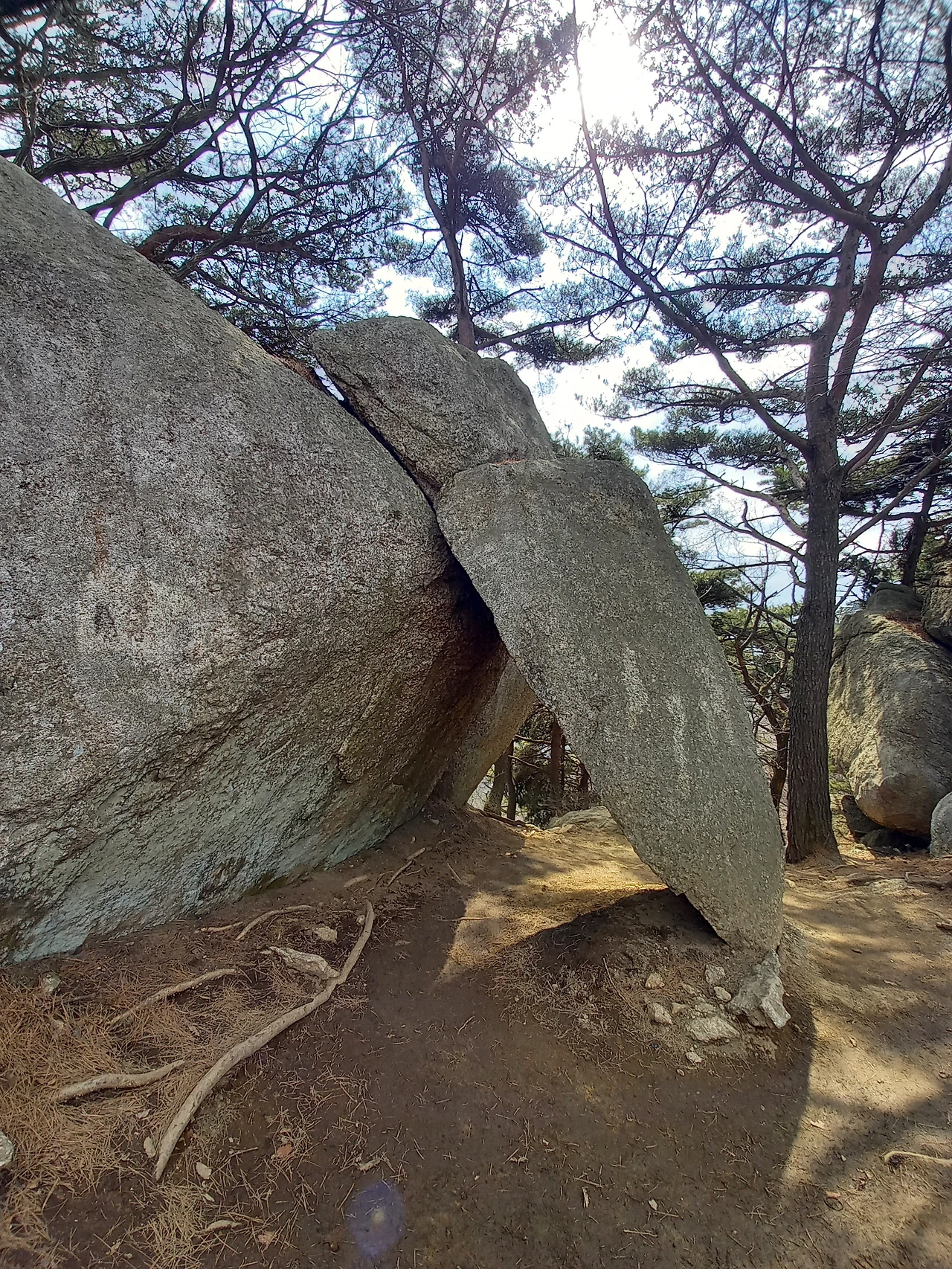 계단을 계속 오르니 헬기장이 나타난다. 주변 조망을 하며 잠시 쉬어간다. 더 오르니 돌문바위와 충혼비 안내가 나온다.