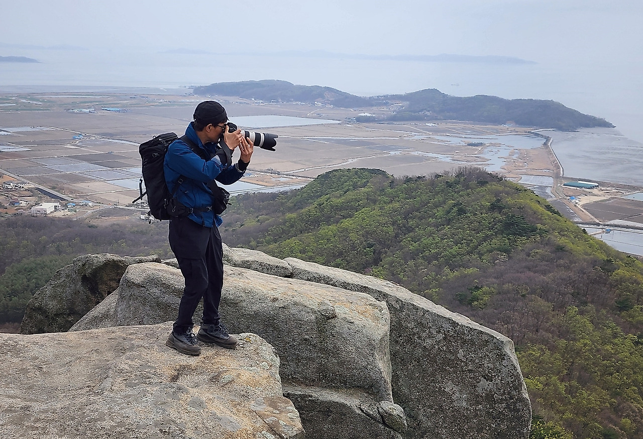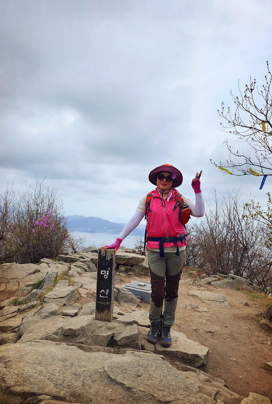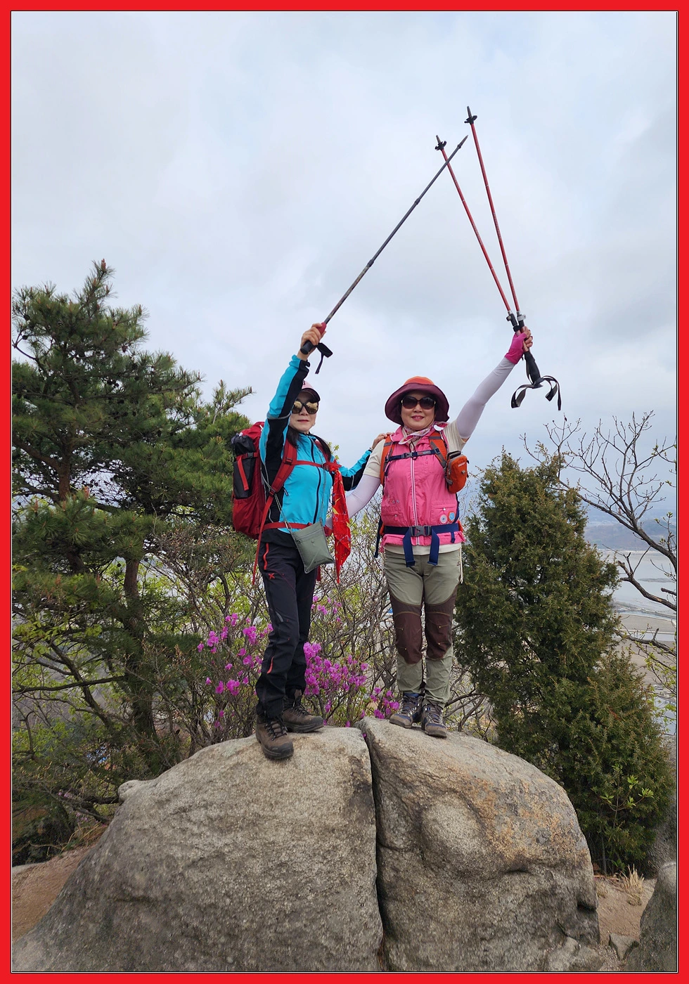 오늘의 작가 정서진님이 커다랗고 무거운 카메라를 들고 와서 사진을 찍어주신다. 조금 오르니 진달래꽃이 만개를 했다. 꽃과 바다와 암릉을 배경으로 한 사람 한 사람 사진 찍기 바쁘다. 행복한 출사산행이다.