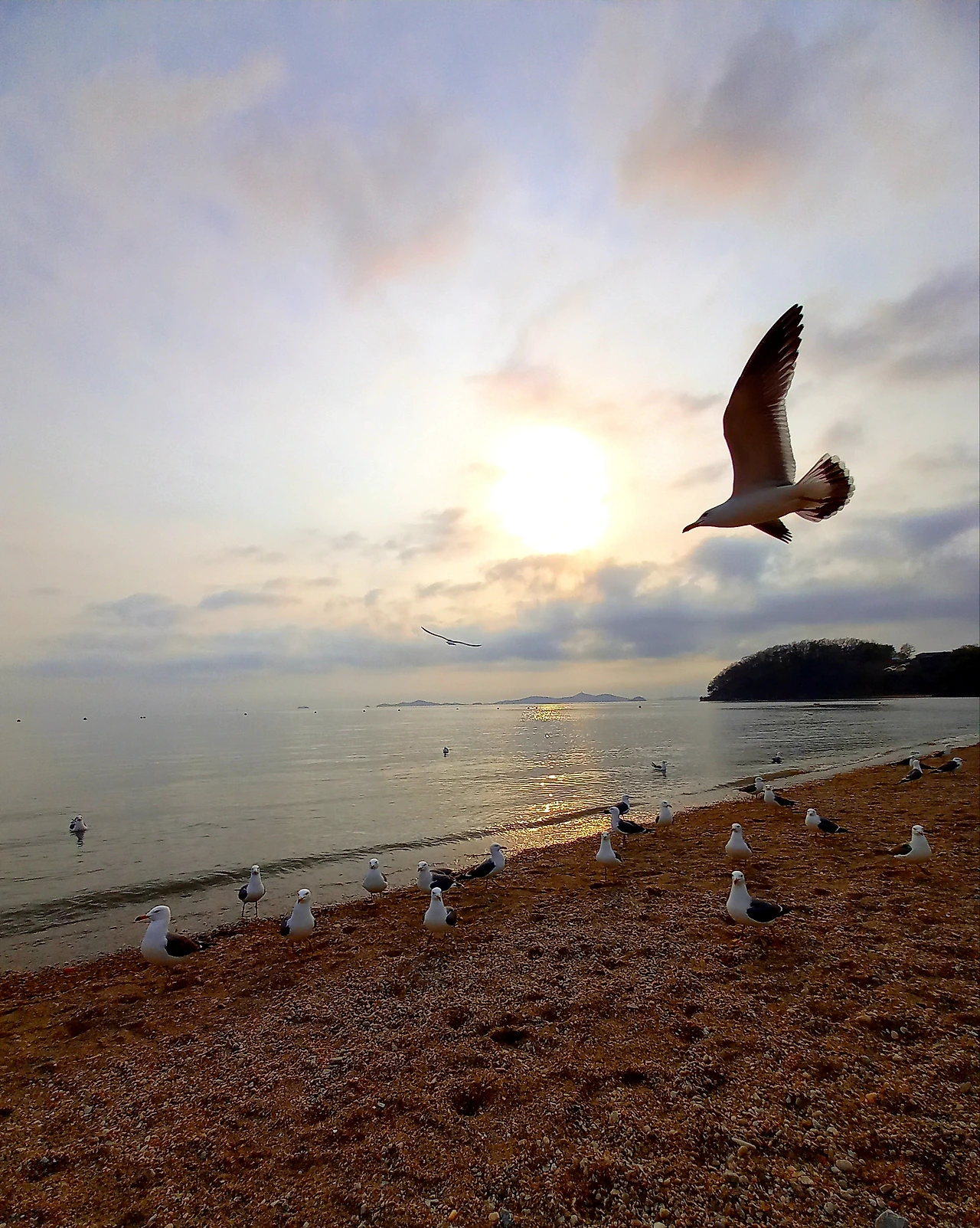 해는 서쪽을 향해 느리게 가고 갈매기들이 모여서 노니는 해변은 얇은 물결을 드리웠다 내리며 철썩인다. 해늘여님들이 새우깡을 사서 갈매기들을 부른다. 새우깡 한 개를 손에 들고 있으면 갈매기들이 채갈 때 짜릿한 손맛을 느낀다. 푸드덕거리며 날아오르는 갈매기들의 몸짓과 석양과 섬을 배경으로 멋진 각도를 잡아 본다.