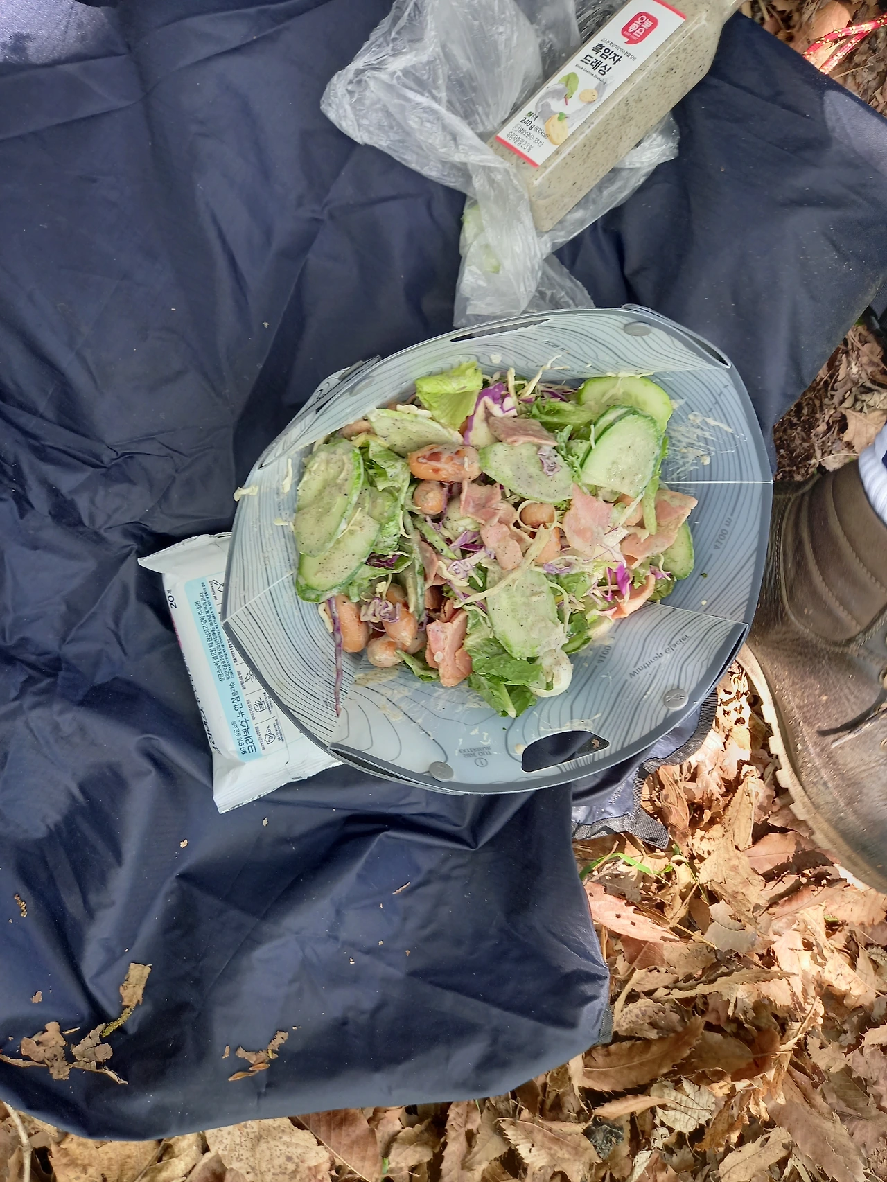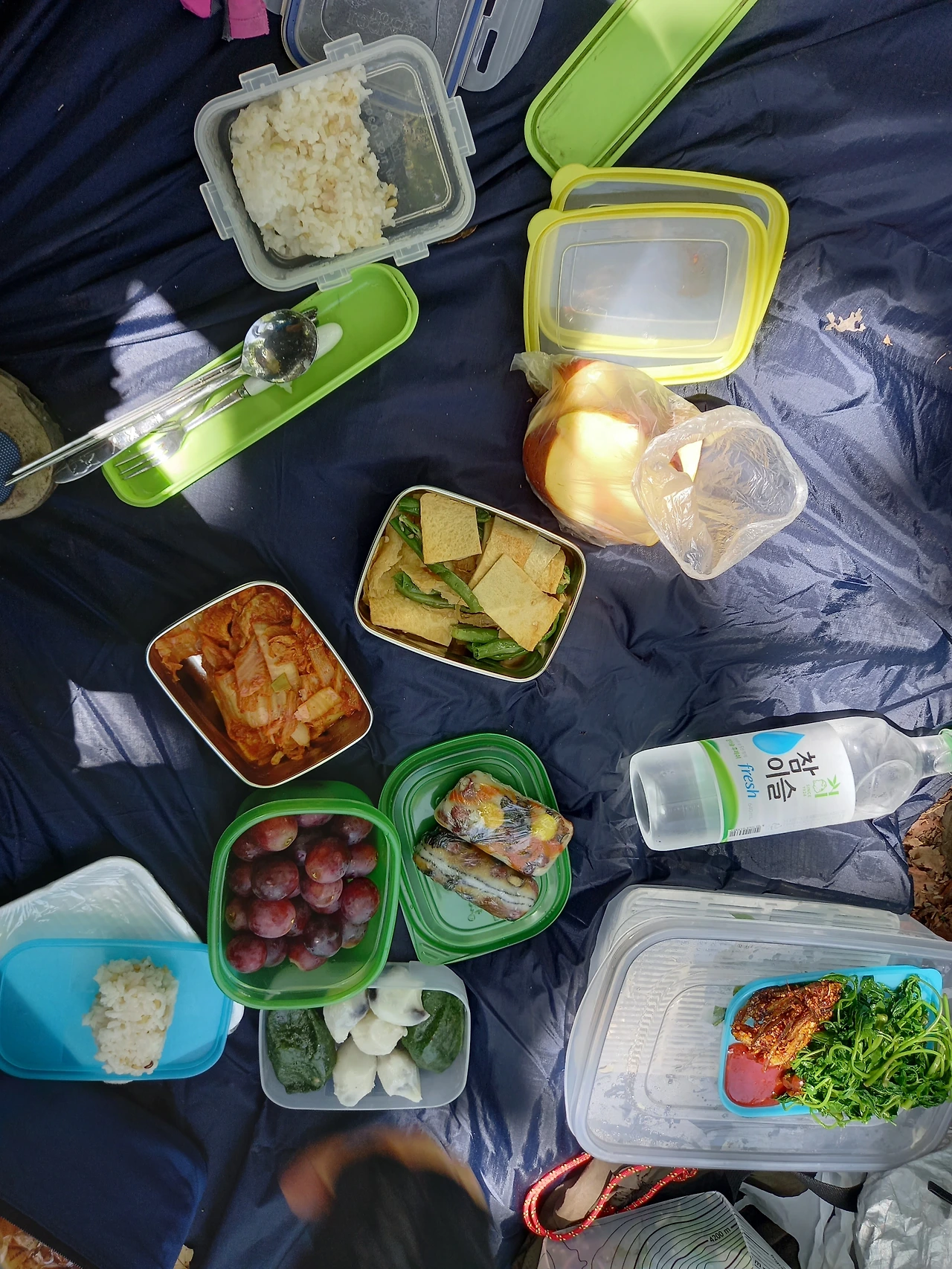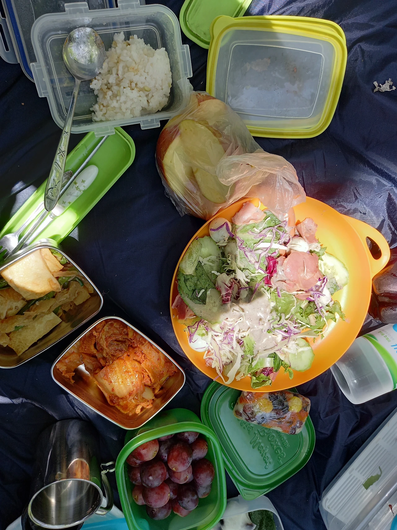 나는 알파산에서는 오늘이 처음이라 어디에 앉나 살펴보다가 남산우 님 세 분 옆으로 간다. 아, 그런데, 마침 그 자리가 알파산 수뇌부들과 함께 한 자리이다. 샐러드 재료를 모두 준비해 와서 즉석요리로 뚝딱 만들어내시는 피오르 고문님 솜씨, 세상에나! 엄청 융숭한 대접을 받은 기분이다. 또 한 분은 산행 후 야외영화를 상영하는 분이라는데 테이블도 가져오셔서 펼치고 만두 등을 주신다.(아직 닉을 외우지 못해 죄송하다.) 또 한 분은 달큼한 포도에 맛있는 각종 떡까지 준비해 오신 킬리(만자로) 님이시다. 나는 밥과 어묵볶음, 김치볶음, 사과를 싸 갔다. 펼쳐놓으니 완전 잔칫상이다. 다 먹고 나니 배가 무지무지 부르다.