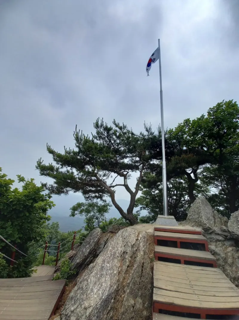 팔각정 조금 못 가서 지인 한 분은 그곳에서 기다린다 하고 둘이서 정상을 향해 간다. 모락산 전투지와 팔각정을 지나 국기봉에 오른다. 조망이 좋다. 약간의 미세먼지가 있지만 사방팔방 멋진 조망을 하고 함께 못 온 지인분을 아쉬워한다.