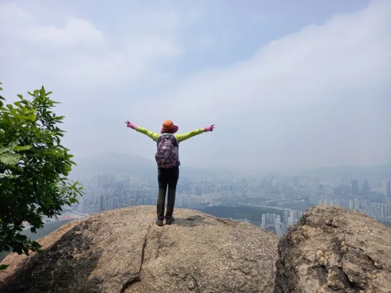 사인암 바위 암릉이 조금 위태로워 보이긴 하지만 의왕시내가 한눈에 내려다보이는 좋은 조망터이다. 지인 한 분은 고소공포증이 있어서 암릉 위에는 못 올라가고 우리는 암릉 위에서 다양한 포즈를 취하며 인증숏을 남긴다.