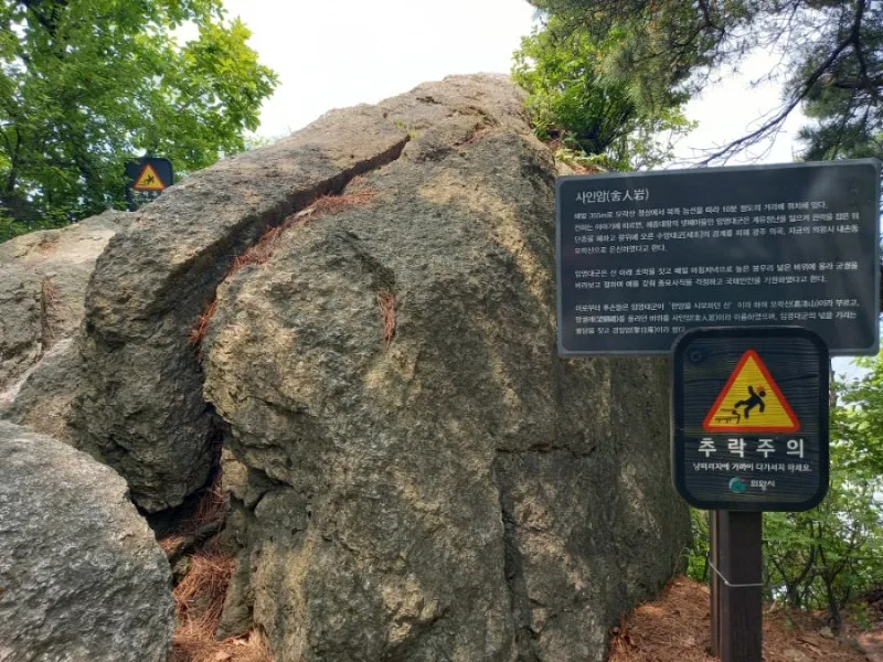 바로 사인암이 나온다. '한양을 사모하던 산'이라는 의미를 지닌 모락산의 역사가 담겨 있다. 세종대왕의 넷째 아들 임영대군이, 계유정난을 일으켜 왕위에 오른 수양대군을 피해 이곳에 와서 지냈다고 한다. 한양을 그리워하며 사인암에서 궁궐을 향해 절을 올렸다고 한다.