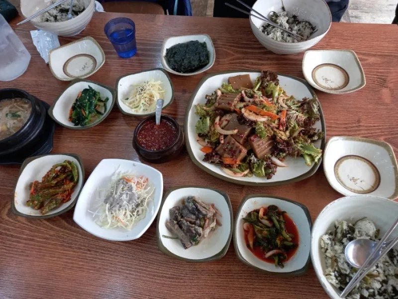 곤드레밥 3인분에 도토리묵무침을 주문해서 먹는데 밥과 반찬들이 집에서 엄마가 해준 것처럼 맛있고 깔끔하다. 간식을 먹은 지 얼마 안 된 시간이지만 그릇을 다 비운다. 식후에는 식혜 한 병을 3천 원에 사서 3층 다과를 할 수 있는 공간으로 가서 마시며 이야기 나눈다. 밥도 먹고 차도 마시고 두 가지를 함께 할 수 있는 식당이라서 좋은 점이 있다. 3층 다과의 공간은 모락산을 바라보며 차를 마실 수 있는 시원한 곳이다. 오늘도 안전하고 즐거운 산행을 감사드린다.