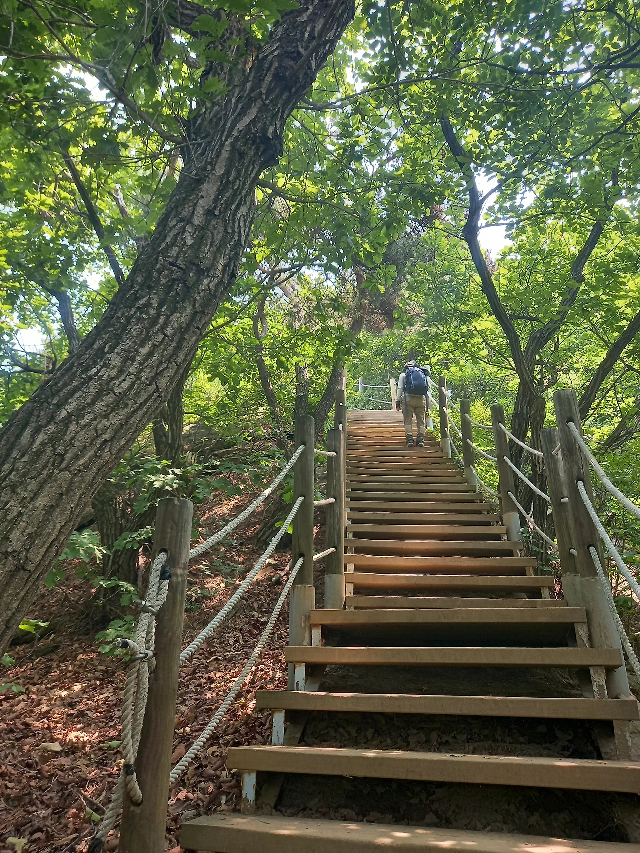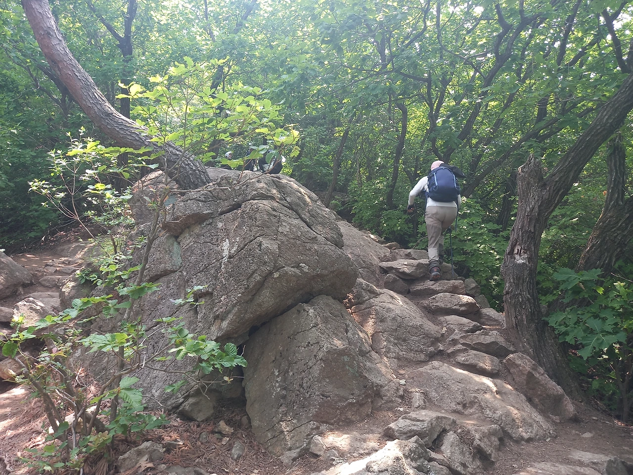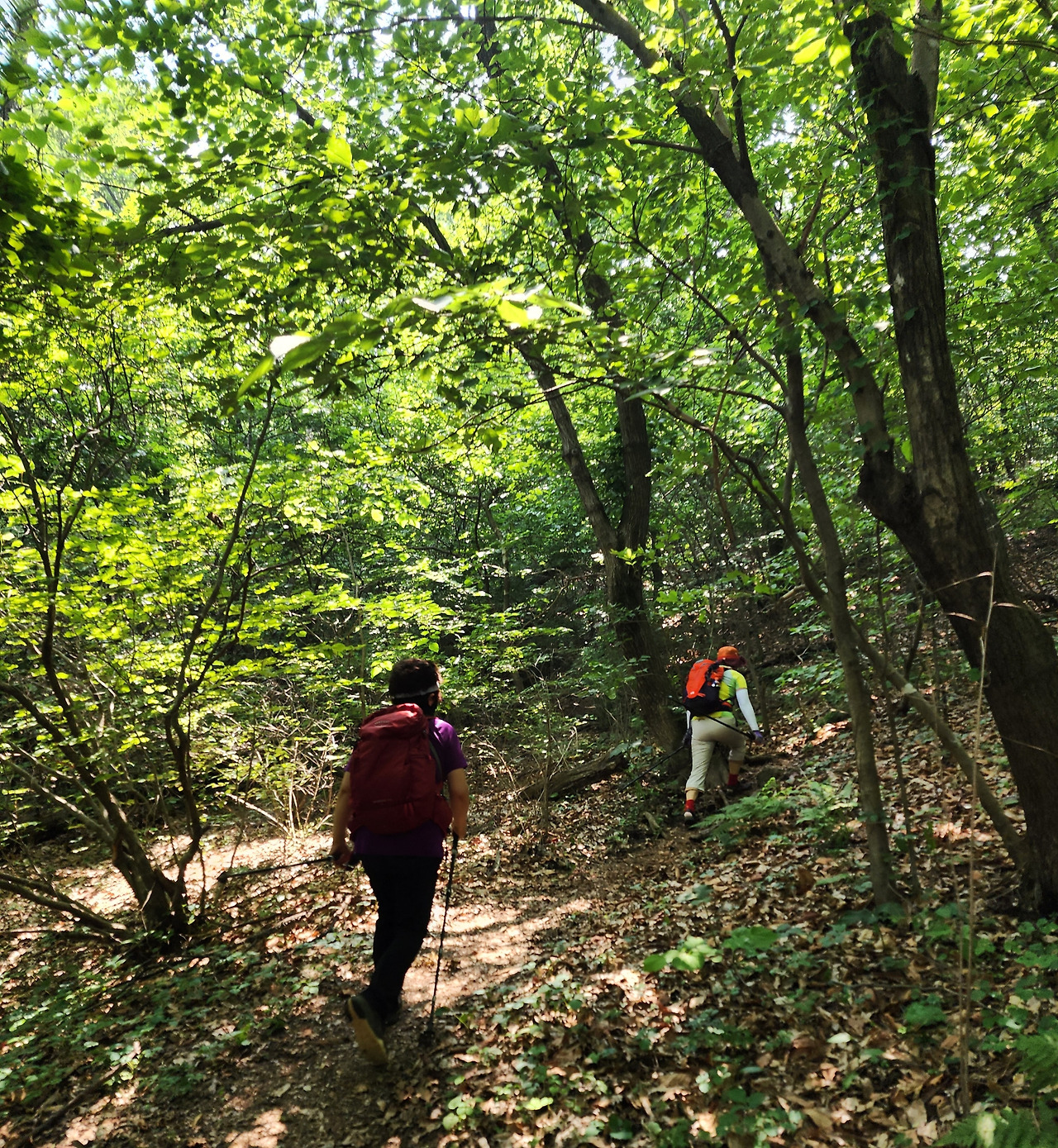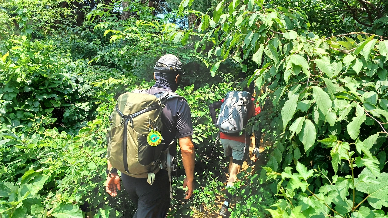 하산할 때는 예정했던 길을 살짝 잘못 들었는가 싶다가 다시 제 길을 찾았다. 그런데, 강풍 대장님이 맨발이셔서 길을 잃은 척하며 또 좋은 길로 우회한다. 선녀폭포로 내려가는 길은 계곡길이어서 돌이 제법 있기 때문이다. 그러다 보니 첫 대장 등극 산행치고 다소 긴 코스가 되었다. 숲이 우거진 그늘길이어서 걷기는 좋았다. 바람도 간간이 불어 주어 땀을 식혀주고 앞서거니 뒤서거니 하면서 도란도란 이야기도 주고받을 수 있었다.