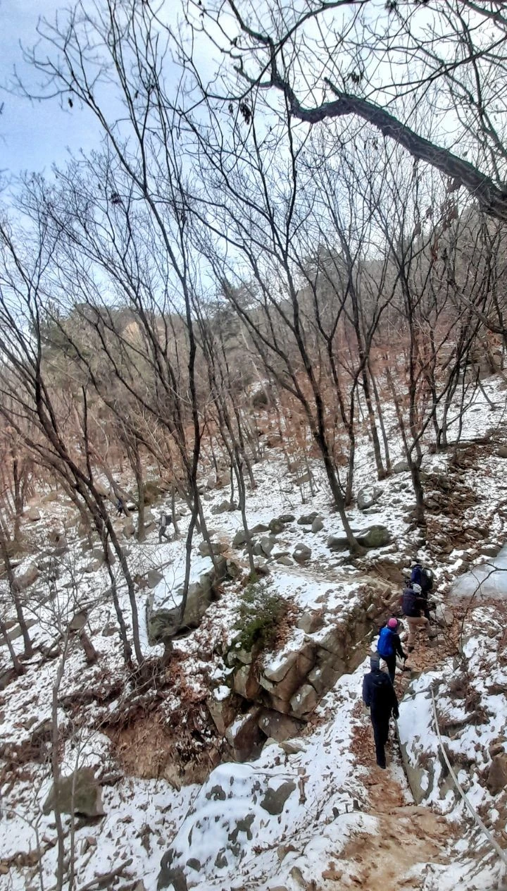 점심 먹고 학우봉 생략하고 편안한 길로만 걷는다. 산에 잔설이 남아 있어서 앙상한 겨울 느낌도 나지 않고 포근하다. 날씨가 꼭 봄날 같다. 바람이 없는 데도 상쾌하고 시원하다.