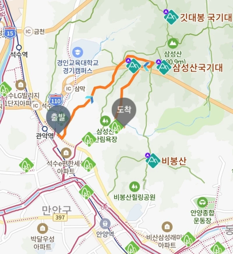 삼성산 산행은 처음 예정보다 거리도 시간도 조금 나온다. 함산한 산우님들이 쉬운 코스를 원해서 막 생략하고 걸어서다. 학우봉도 삼막사도 안 들르고 제1전망대 방향으로 해서 바로 안양예술공원으로 하산한다.