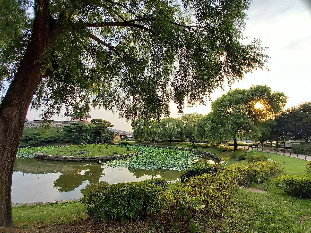 방화수류정이 우뚝 솟아 위용을 자랑하고, 수양버들이 흐드러지게 가지를 드리우고, 연꽃이 풍성하게 잎을 펼친 용연을 바라본다. 나무의자 벤치에 앉아서 간단하게 싸간 찹쌀떡과 참외를 꺼내 한두 개씩 먹는다. 물도 한 모금씩 마신다. 곧 통닭집에서 뒤풀이를 할 예정이어서 배가 부르면 안 되기 때문이다.