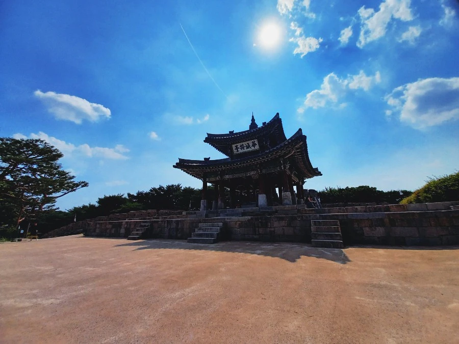 서장대 2층에 올라가면 발아래 펼쳐지는 풍경이 더 멋들어지게 보일 듯하다. 마주 보이는 저 건너편은 봉돈 쪽이다. 비상시에 봉화를 올리는 장소이다. 서장대에서도 수원화성행궁에서도 잘 보일 수 있는 위치이다.