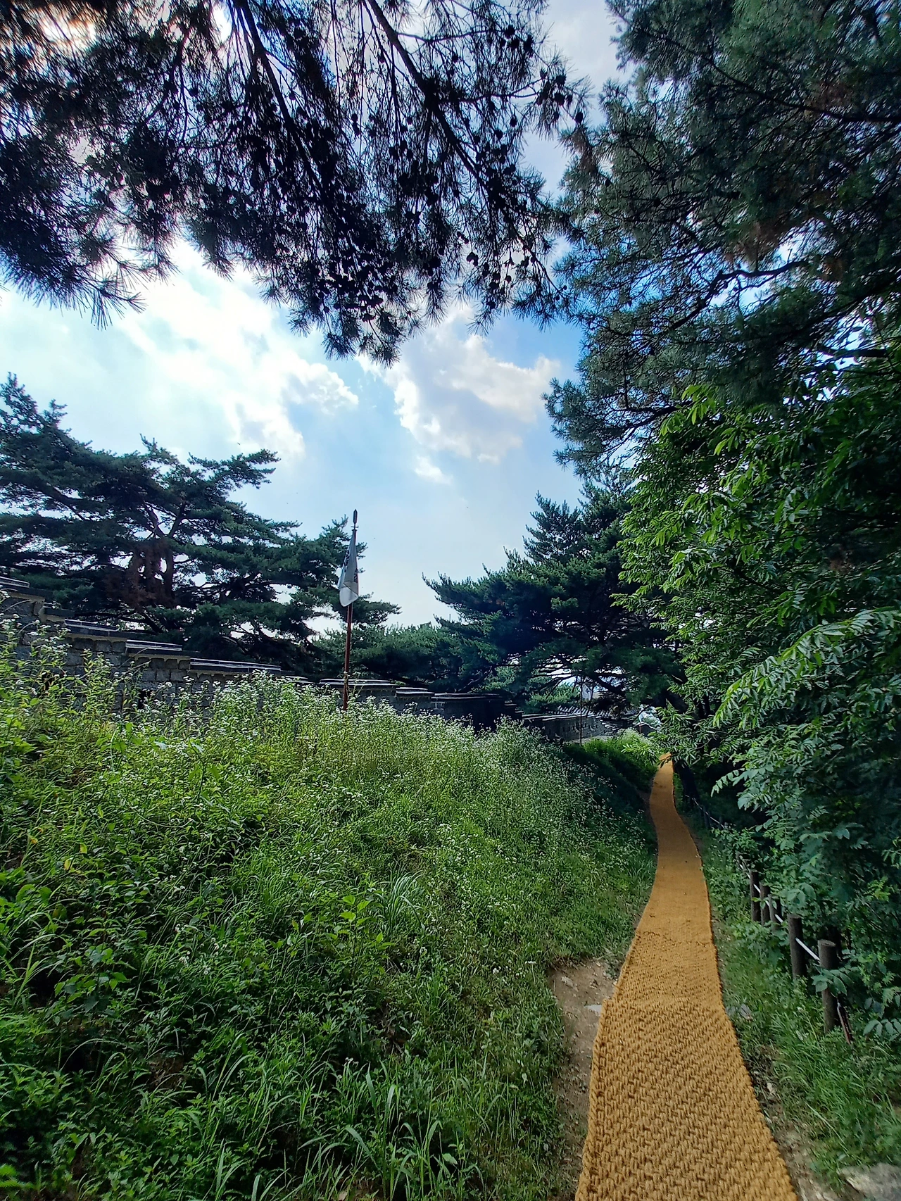 서장대에서 성벽을 따라 걷지 않고 약간 아래쪽 숲길로 들어선다. 나무가 울창하게 우거져 있고 길도 폭신폭신 걷기가 좋다. 흙길과 멍석길이다. 자전거를 타고 걸어도 좋을 것 같은 길이지만 이곳이 세계문화유산이라 자전거나 오토바이 등은 출입이 안 될 것도 같다.