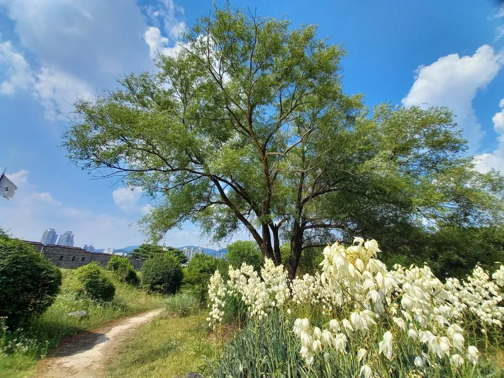 개망초 꽃길, 실유카 꽃길이 여름산행을 빛나게 한다. 하얀빛, 우윳빛, 꽃색깔이 청빛 하늘과 하얀 구름과 초록 숲과 잘 어우러진다.