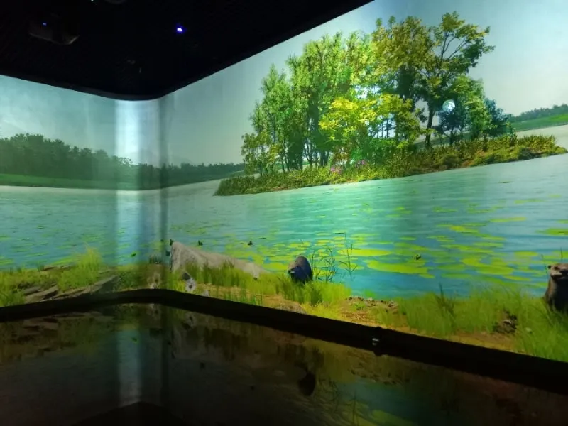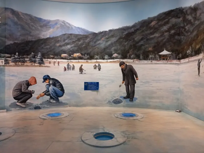 의림지 역사박물관에서 사계절을 미디어아트로 보여주는 곳에서 감상을 하고, 겨울 낚시하는 광경이 정겨워서 그 앞에 앉아서 기념삿을 남긴다. 어린 시절 아버지와 함께 즐기던 강에서의 얼음낚시 추억이 아련하게 떠오른다.