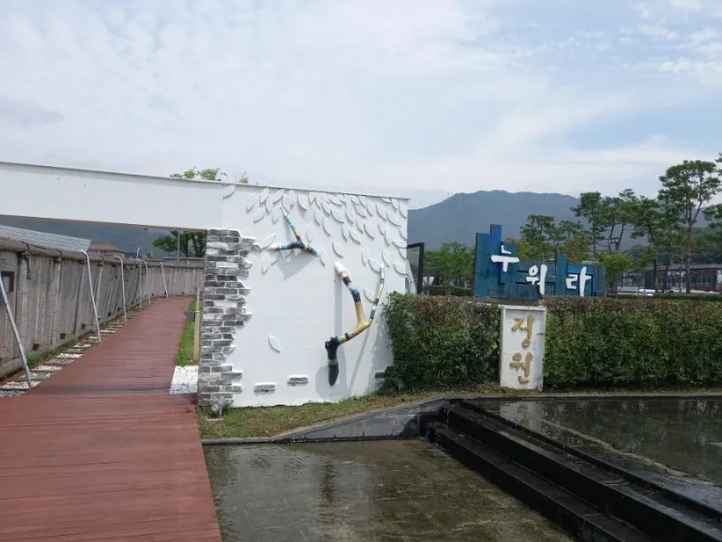 그런데 근처로 가니 아직 한참을 더 가야 한다. 한옥대문처럼 보이는 다리문을 지나 빙 한 바퀴를 돌아서 또 절벽 위를 데크길을 따라 위로 올라갔다 내려와서 다시 이곳으로 나와야 한다. 용추폭포로 보이는 곳에는 물이 하나도 없다.