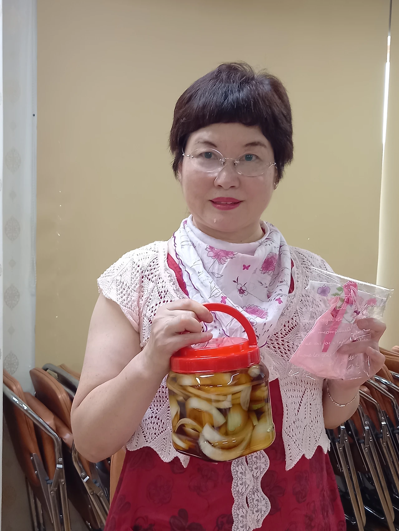 양파장아찌 제험을 진행하시는 분이 '혼자 온 사람 손 들어 보세요' 하고, 팀으로 온 분들 모두 나이를 더해서 제일 많은 팀에게 작은 한복 모양 주머니에 담긴 방향제 선물을 주신다. 나는 혼자 왔으니 당연히 당첨이다.