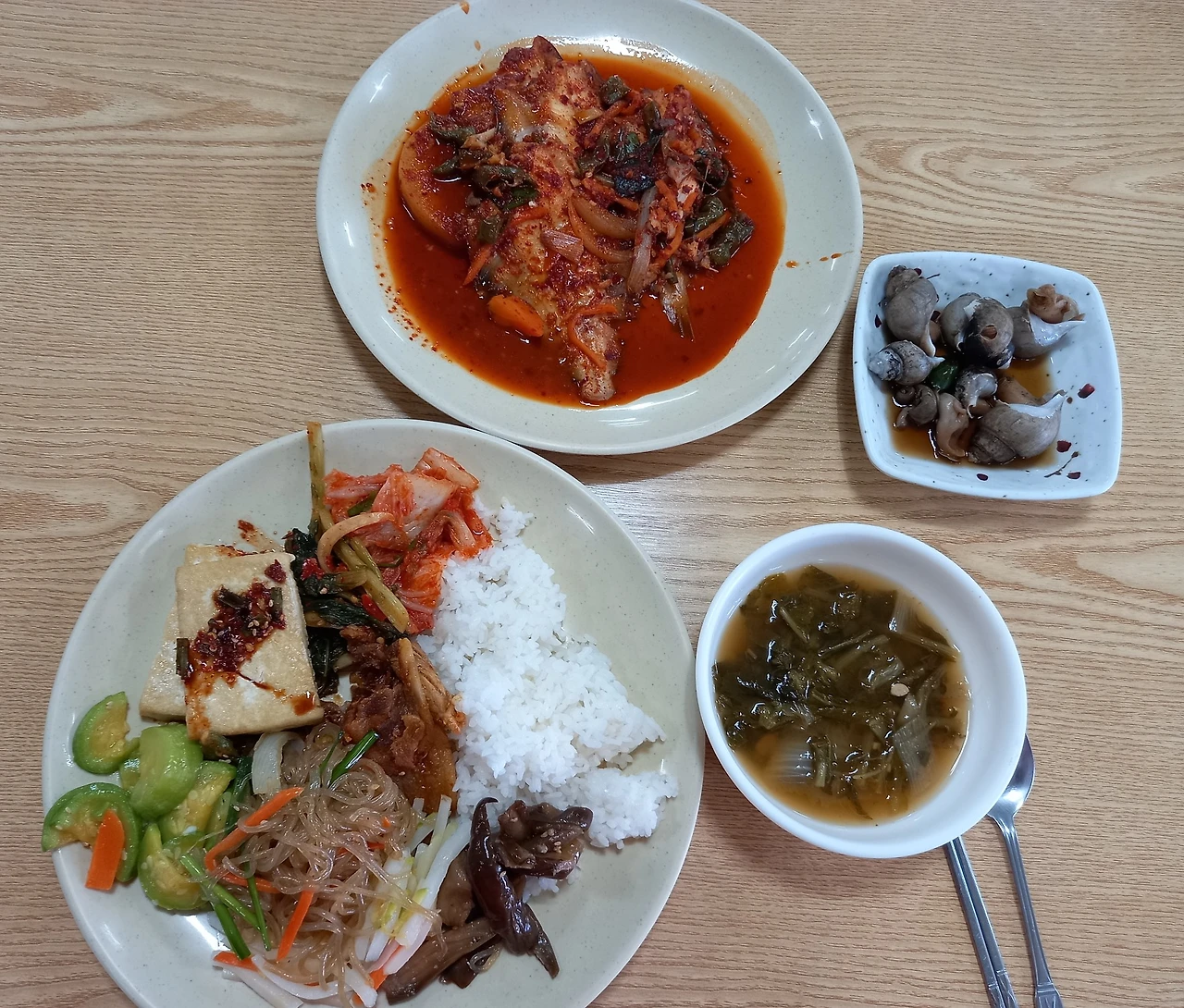 식당으로 점심 먹으러 간다. 4인이 앉아야 자연산 가자미조림과 골뱅이장아찌를 서비스로 준단다. 뷔페식 식사인데 역시나 맛있다. 골뱅이도 세 접시나 갖다 주어서 푸짐하게 먹는다. 간이 딱 맞고 식감이 꼬들꼬들하다. 나는 10개 정도 가져다 살을 빼먹는다. 여행사에서 올 때마다 느끼는 거지만 여행비에 포함되어 있는 식사가 최고이다. 무엇보다 그 지역의 농수산물로 만든 식탁이라 영양과 맛이 일품이다. 지자체에서 특별히 신경을 많이 쓴 흔적이 보인다.