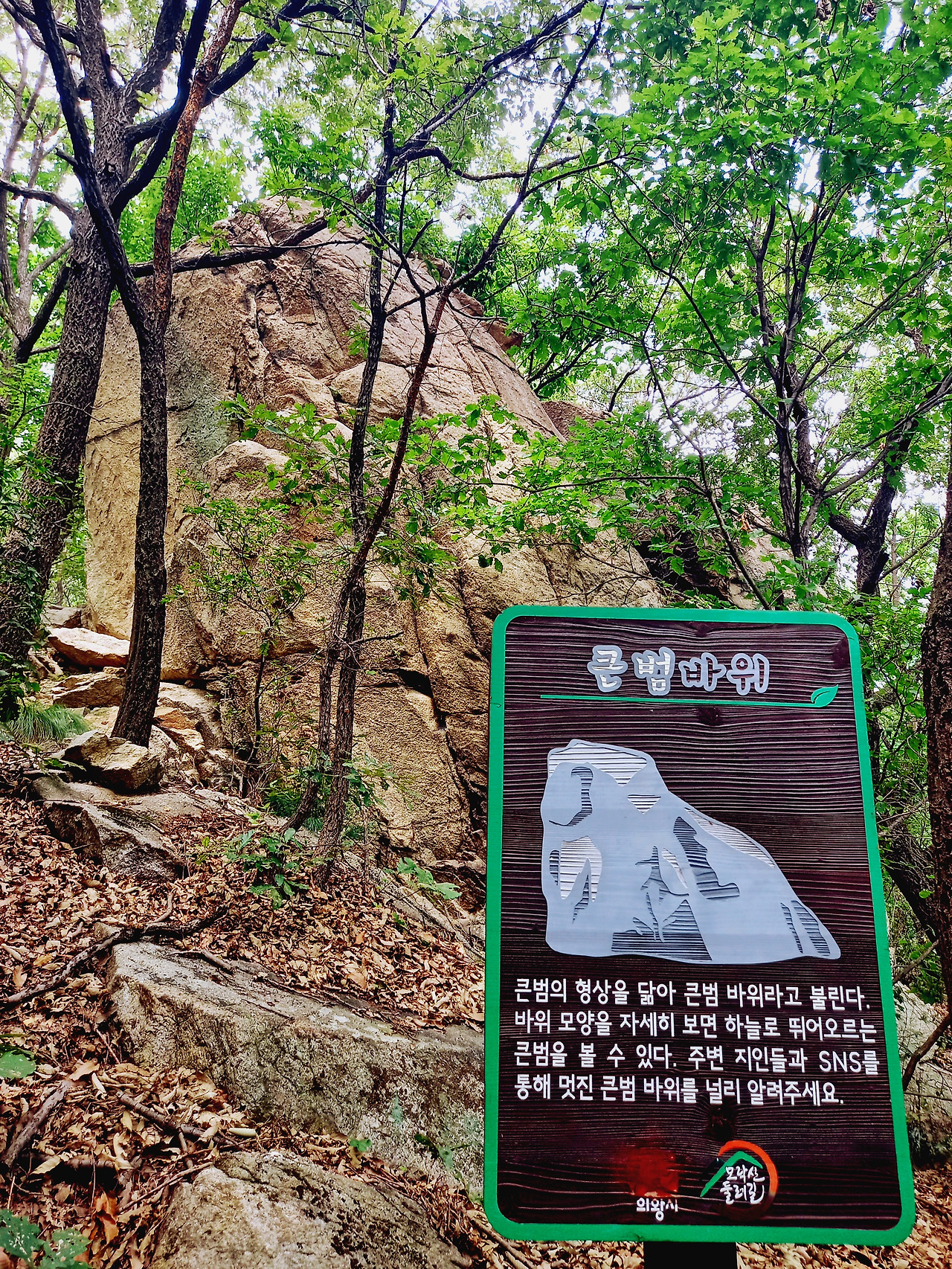 드디어 갈림길, 다른 길로 들어선다. 능선길 흙길 내가 좋아하는 길이다. 그런데 조금 내려오니 보니까 길이 완만하게 경사가 있다. 이곳으로 올라왔으면 오름길에 약한 나는 꽤 힘들었겠다. 땀도 많이 흘렸겠다. 군데군데 바위들도 제법 있는데 그중 이름표가 붙은 것은 큰범바위이다. 일부가 나무에 가려서 큰범의 형상을 찾아보기는 쉽지 않다.