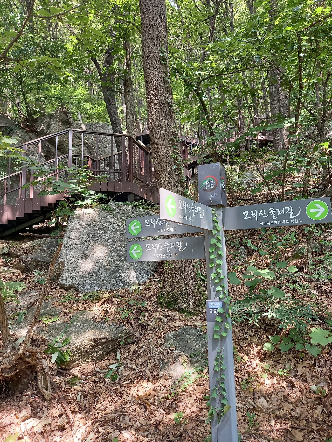 모락산은 두 번째 산행이다. 코스가 5km 내외라 그리 길지 않고, 대체로 완만한 흙길이고, 하늘이 안 보이는 초록숲길이라서, 한여름에 걷기에도 좋은 산이다. 특히 정상 국기봉 조망이 좋다. 그곳에 서면 인근 도시가 한눈에 다 들어오고 주변 산 봉우리들도 모습을 드러낸다. 내가 방향감각이 없어서 저기가 어느 도시이고 어느 산인지만 잘 모를 뿐이다.