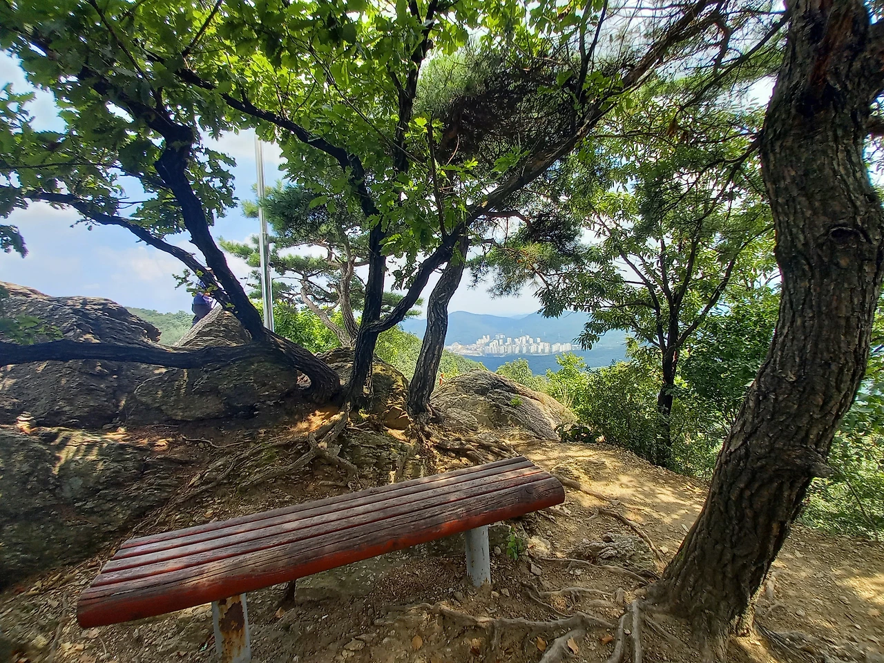 적당한 암릉구간 지나 국기봉에 서니 바람이 제법 분다. 높이 솟은 깃대에 태극기 펄럭이는 소리가 힘차다. 아무도 없어서 인증사진을 어떻게 남기나 궁리를 한다. 셀카로는 태극기가 나오는 지점이 도저히 안 잡힌다. 몇 자 찍기는 했지만 태극기가 안 나온다. 국기봉 뒤쪽으로 가본다. 의자 두 개가 나란히 놓여 있다. 누우면 내 키에 딱 맞을 크기이다.