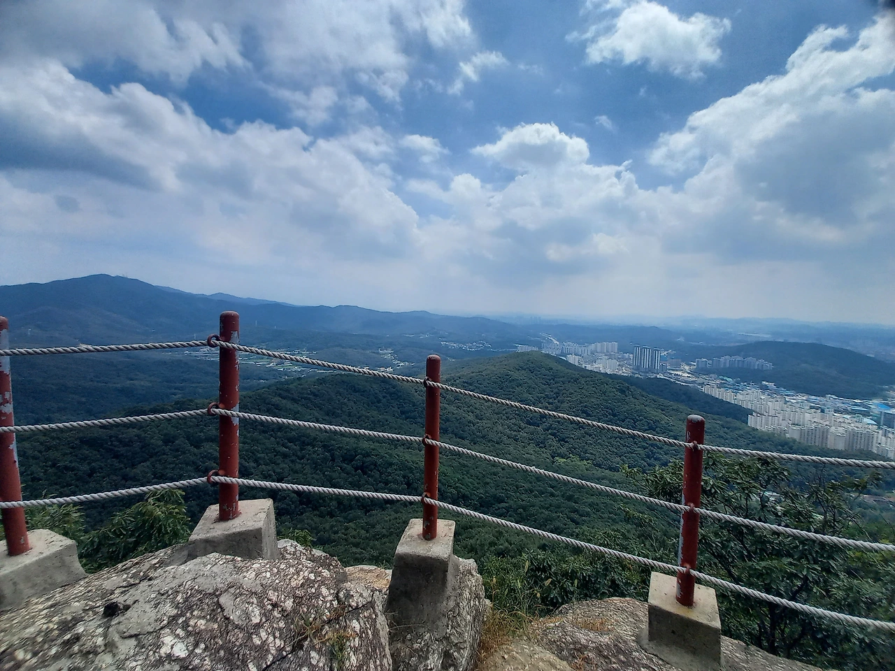 큰 소리로 인사하고 국기봉 뒤쪽 암릉으로 가서 주변 조망을 한다. 아파트가 있는 인근 도시와 산봉우리들의 조화가 이색적이다. 부조화인 듯하지만 조화롭다.