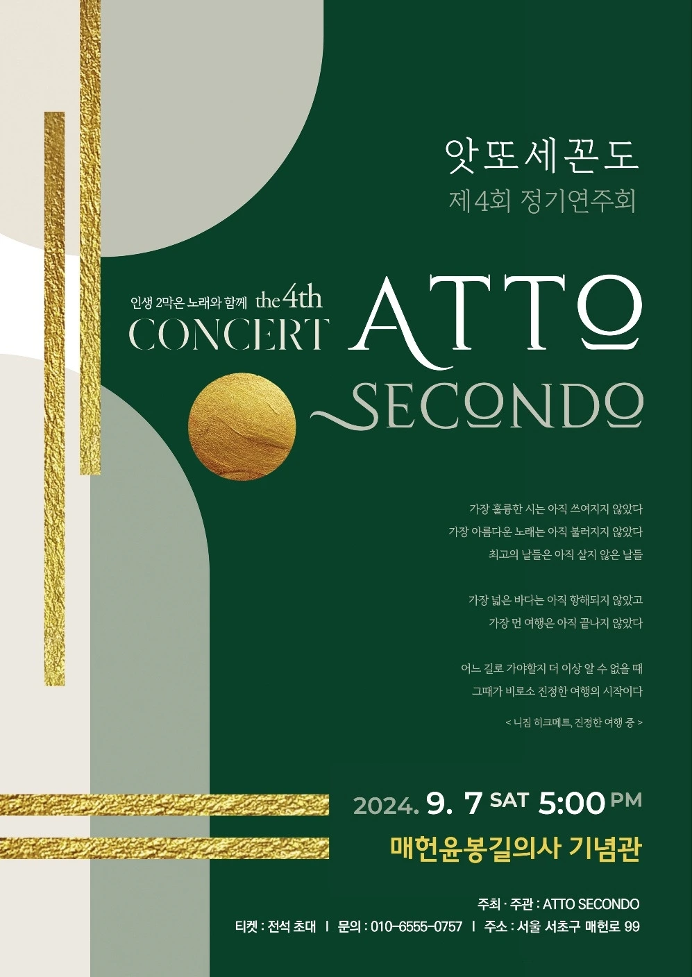 앗또세꼰도 콘서트 역시 프로 못지않은 분들이 눈에 띄었다. 1부는 한국 가곡, 2부는 세계 가곡과 아리아 순서로 이어졌는데, 심금을 울리는 노래 가사가 내게로 달려온다.