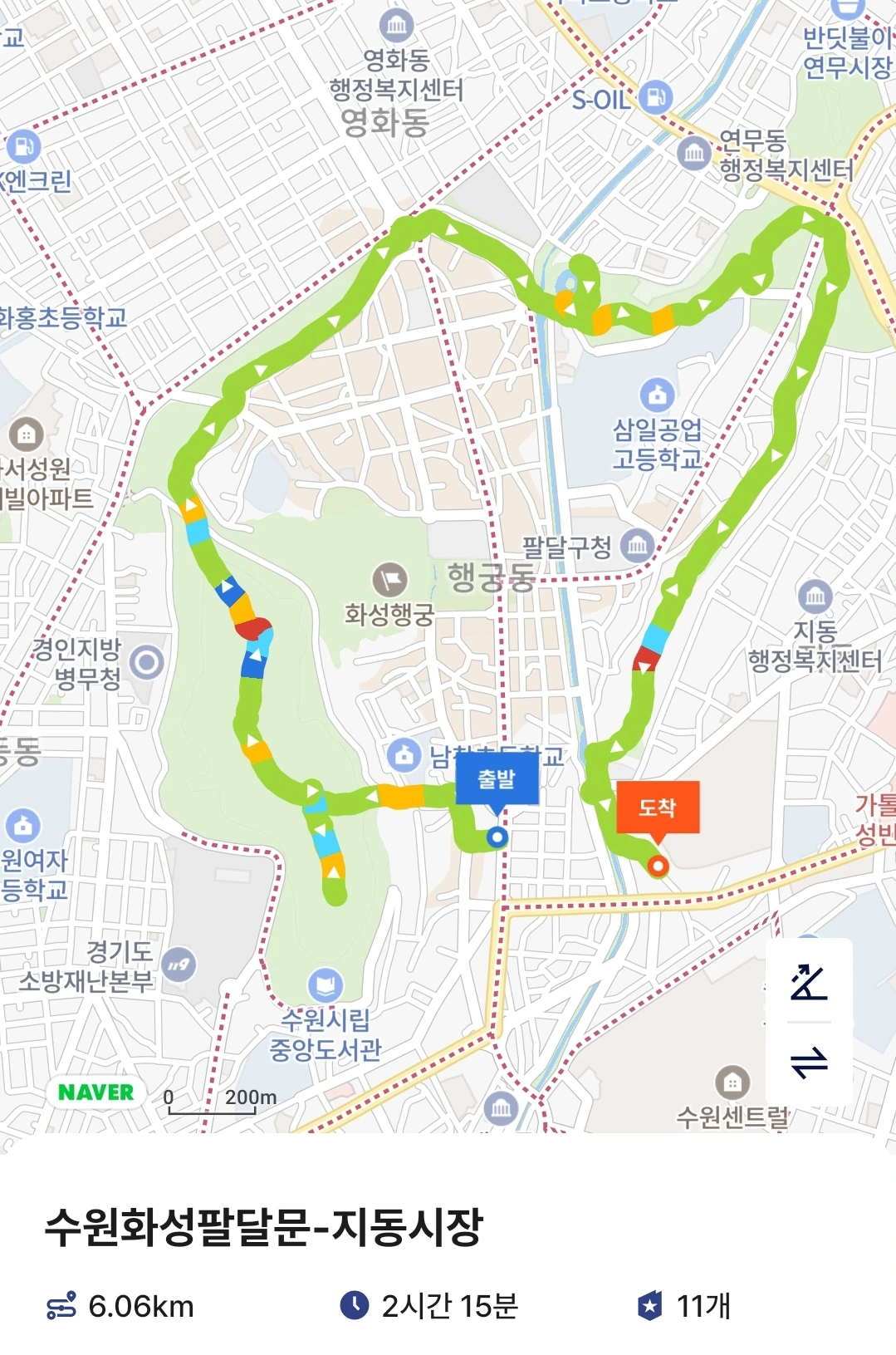 수원화성성곽길을 풀코스로 걸으면 거리와 시간 소요가 얼마나 될까 궁금하여 시간을 내보았다. 팔달문에서 시작하여 한 바퀴 둥글게 돌아서 다시 팔달문으로 돌아오는 코스이다. 대략 예상하기는 총 5km, 3시간 소요되겠다 싶었는데, 다 걷고 트랭글 운동기록을 보니 약 6km, 2시간 15분이 소요되었다. 혼자 걸으니 사진 찍는 시간도 절약되고, 조금 빨리 걸은 듯하다. 간식 먹는 시간은 한 15분 정도 걸렸다. 거기다가 수원화성행궁은 여러 번 가본 곳이라 생략했다. 그렇지만 모두 다 간다고 했을 때 대략적으로 약 7km, 3시간 소요로 잡으면 넉넉할 것이다.