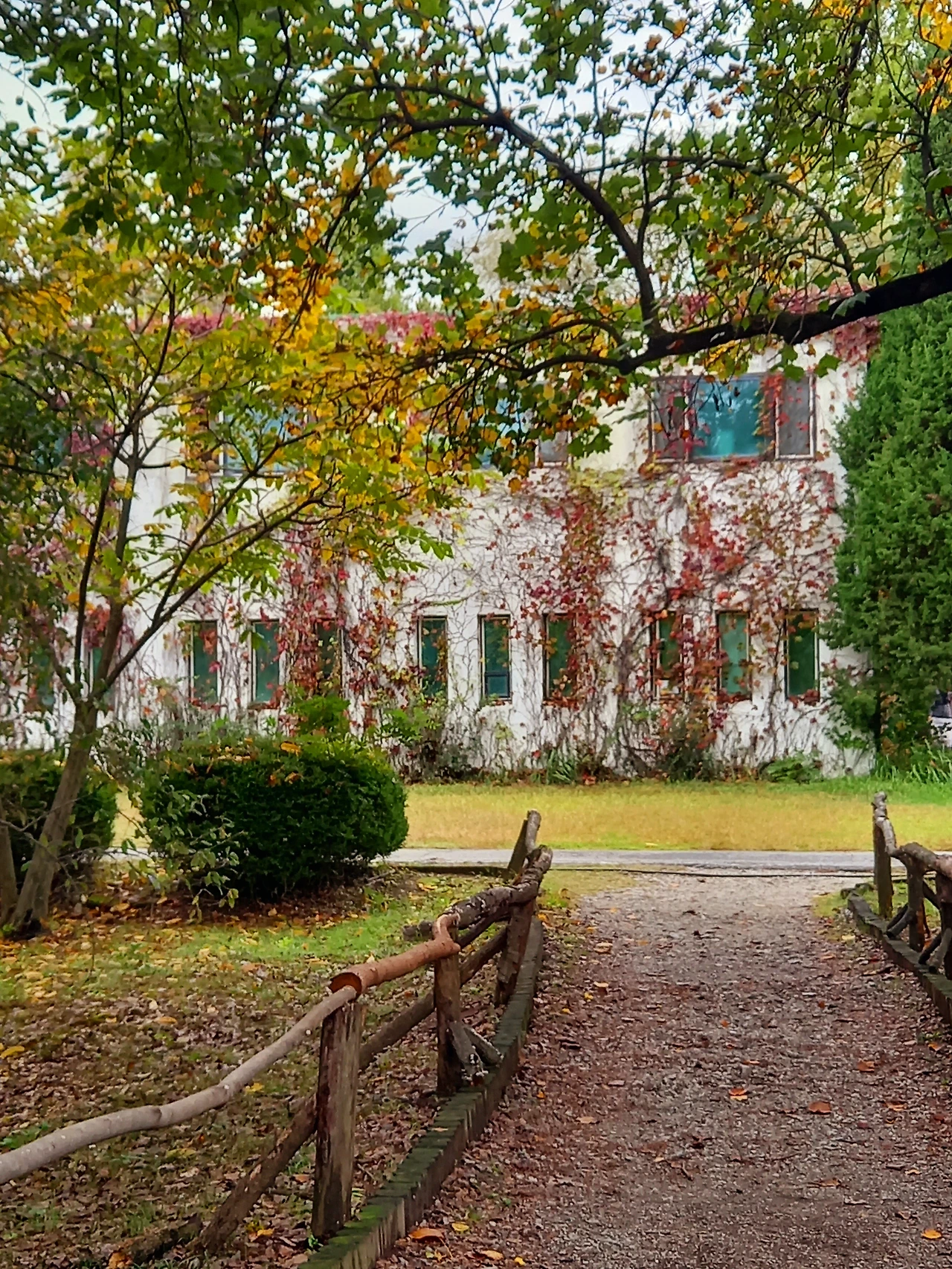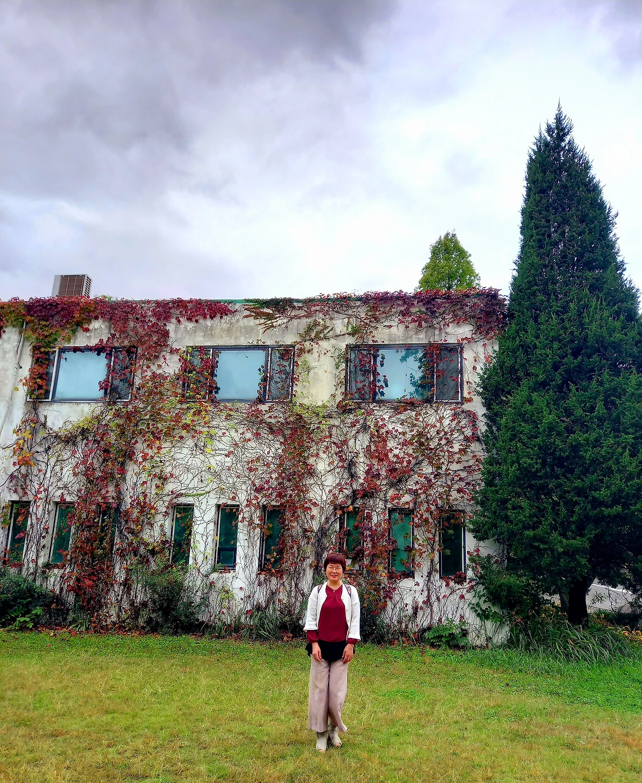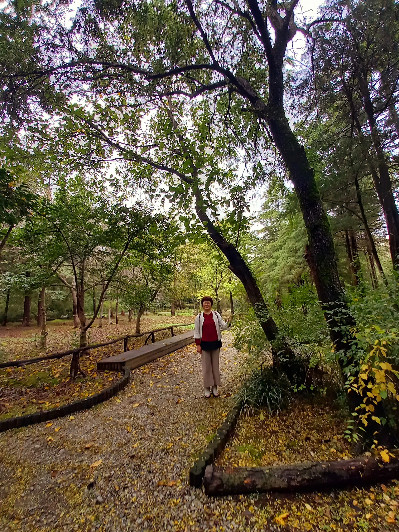 화분에 심어놓은 댑싸리는 땅에서 자라고 있지 않아 조금 아쉬웠고, 건물을 단풍이 든 담쟁이가 덮은 모습이 운치가 있어서 배경으로 하고 서서 사진에 담는다. 아마도 이 건물은 임업연구소 같은데 관계자 이외에는 들어갈 수 없는 공간이다. 숲. 환경. 인간이라는 돌비를 지나 좌회전을 해서 단풍숲길로 들어선다. 올해는 어딜 가나 단풍이 시원치 않단다. 이곳도 그렇다. 어제 비가 많이 내려서 땅이 젖어서 물컹물컹하다. 낙엽도 물에 젖어있다. 다행히 신고 나온 신발이 굽이 조금 있는 거라서 양말 속으로는 물이 안 들어온다.