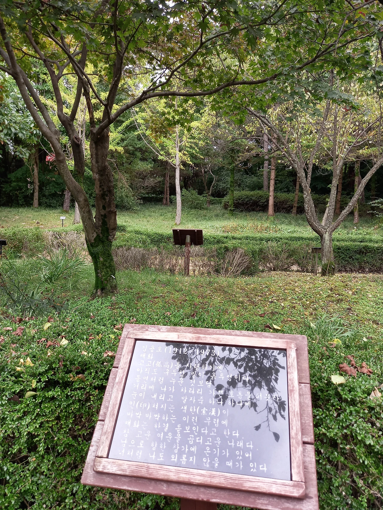 <향토예술의 나무원>이라는 곳에는 진달래, 매화, 소나무, 오동나무 등을 심어놓고 시인의 시 구절을 안내판에 함께 적어놓았다. 김소월, 이병기, 조지훈, 김용호 시인 등의 시 구절을 읽어본다. 소나무길 지나가니 <수생식물원>이 나온다. 수목원에 호수가 있으면 한결 멋지다. 연이 가득한 호수는 아래로 내려가야 해서 반바퀴만 돌고 전망대 쪽으로 간다. 아직 물들지 않은 초록 단풍숲길 지나 무궁화동산이 나온다. 꽃은 한두 송이 남아있을 뿐이다. 신기한 것은 무궁화에도 여러 종류가 있는데 꽃모양과 색깔에 따라서 무슨 무궁화라고 부른다. 그런데 안내 글씨가 거의 다 벗겨지고 지워져서 겨우 알아볼 수가 있다.