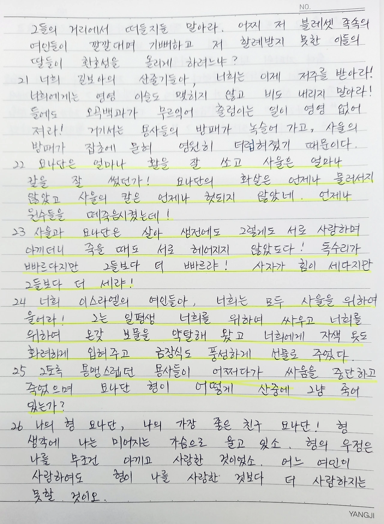 다윗이 하나님 마음에 합한 사람이 된 것은 사울왕에 대한 이런 태도도 한몫하지 않았을까 싶다. 하나님께서 다윗을 왕으로 세우시고 하나님이 항상 다윗 편인데, 이 세상 그 누구가 감히 다윗을 대적할 수 있겠는가? 나라의 왕이라도 감히 하나님과 대결할 수는 없는 것이다. 하나님에 대한 철저한 믿음, 그것이 바로 다윗이 사울의 죽음을 진심으로 슬퍼하고 '활노래'를 지어 부르며 애도한 이유일 것이다.