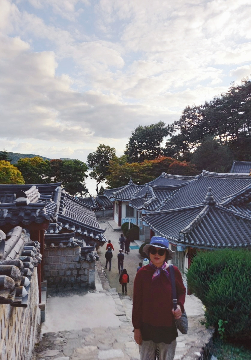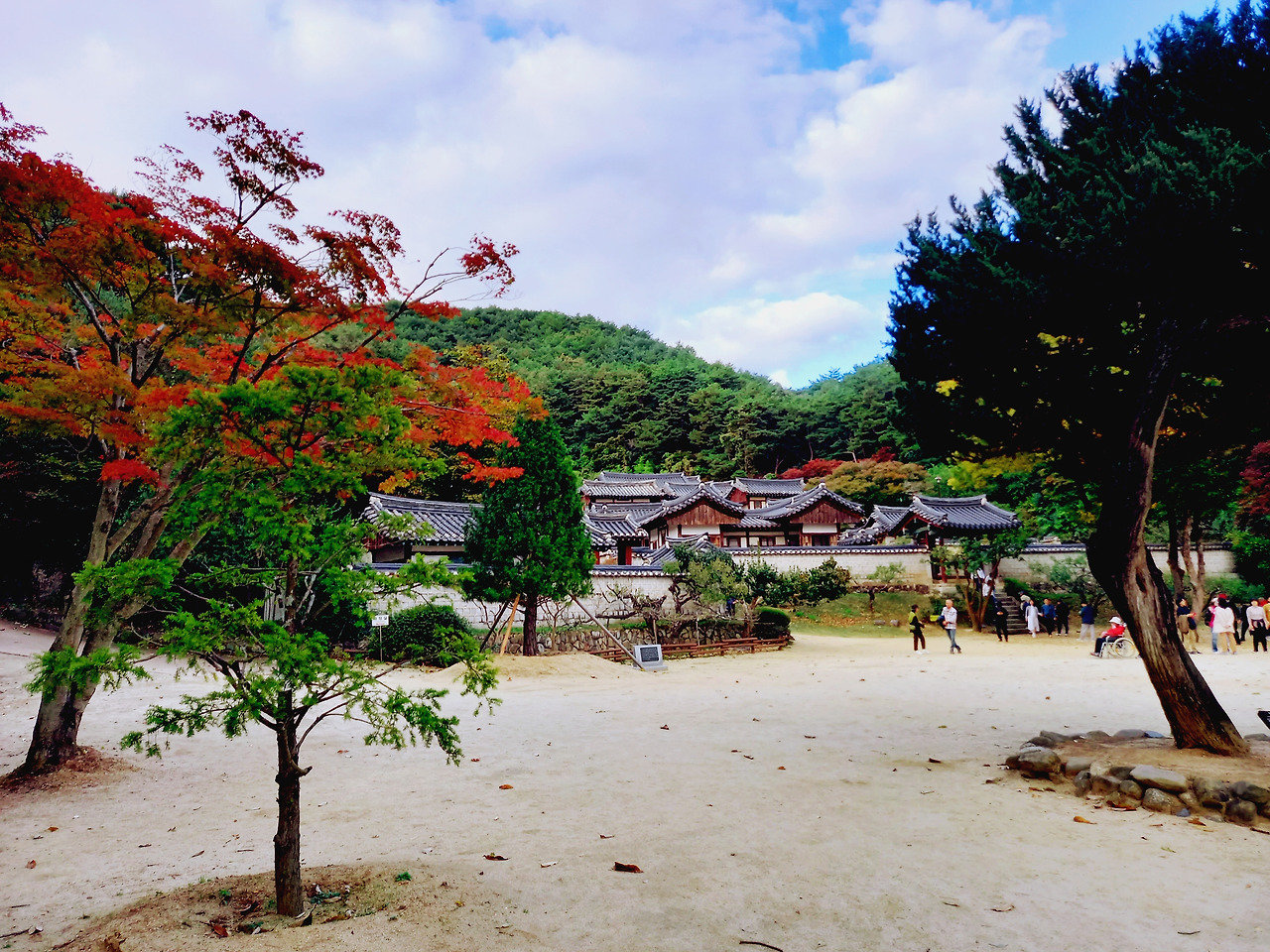 다산초당 내 나무들은 단풍이 들어 한옥 분위기와 잘 어우러진다. 출입문을 통과하면서 보는 한옥들의 기와와 돌길, 돌담, 낙동강의 어우러짐이 한 폭의 그림이라서 아무 데나 서서 담아도 퇴계 이황 선생이 살던 옛 시대로 돌아간 듯 멋스럽다.