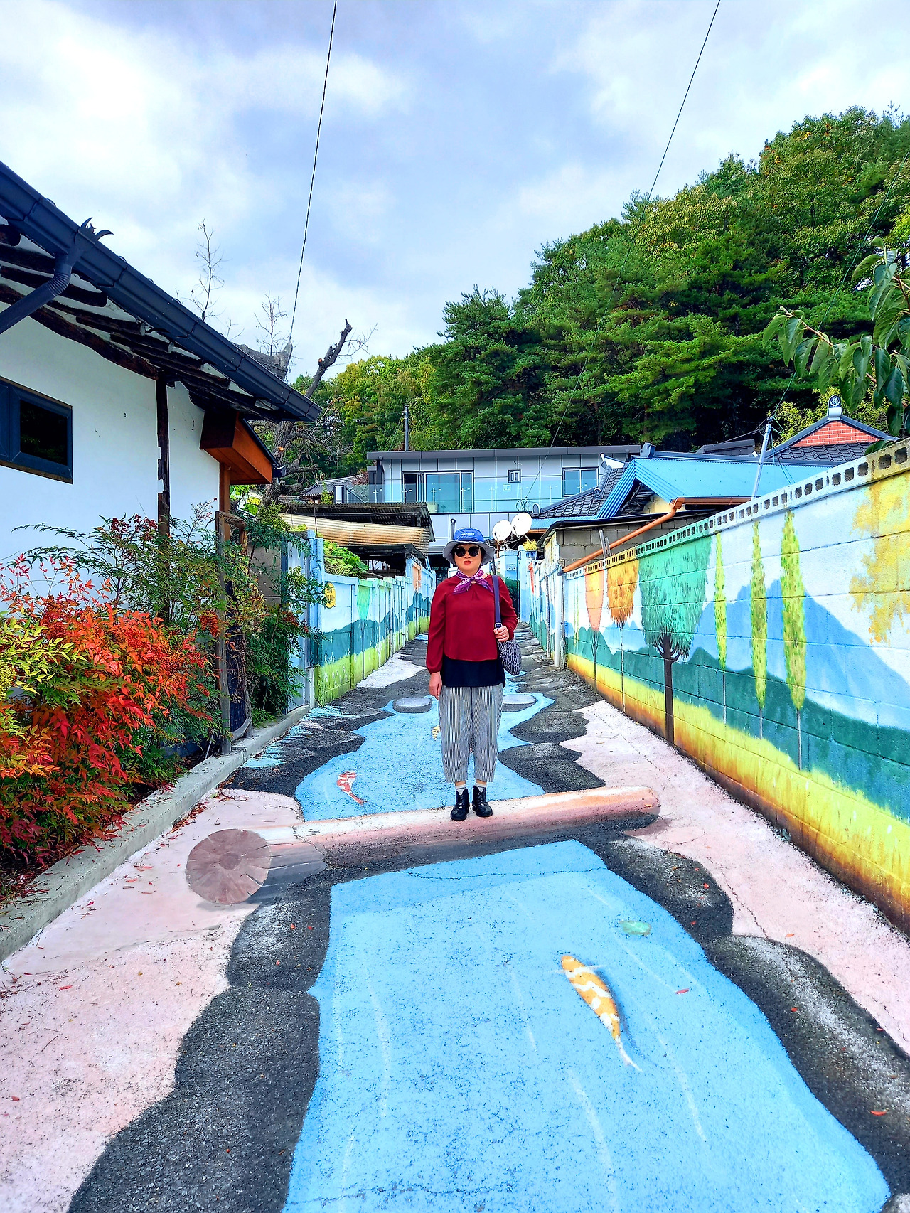 예끼마을 초입에서 강이 흐르고 통나무 다리가 있는 길 위 벽화에서 사진 한 장을 남기고 소수서원으로 간다. 시멘트 바닥에 그린 벽화인데도 꼭 강 위 다리에 서 있는 것 같다.