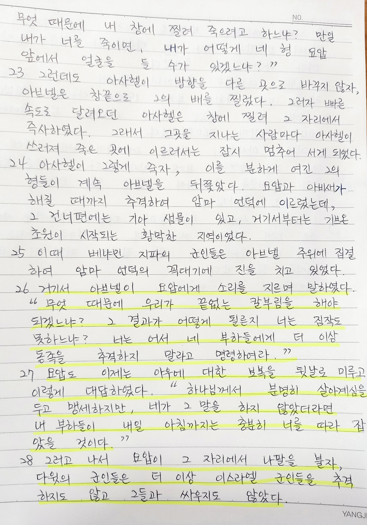 사정이 이렇다 보니 사울의 군대장관 아브넬과 다윗의 군대장관 요압과 아우들 아비새, 아사헬은 계속해서 싸움을 할 수밖에 없다. 서로가 세워진 왕에 대해서 인정하고 받아들이기가 쉽지 않았던 것이다.