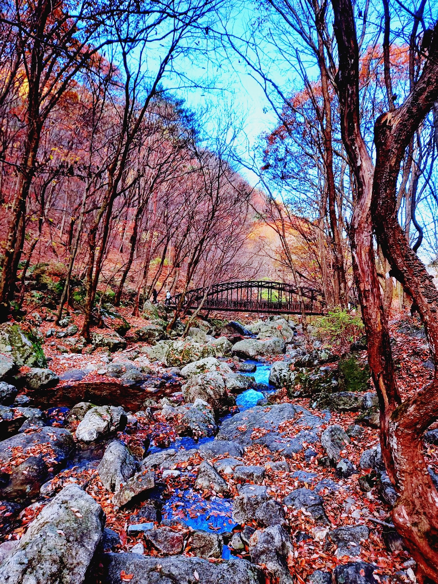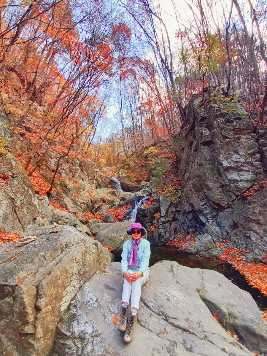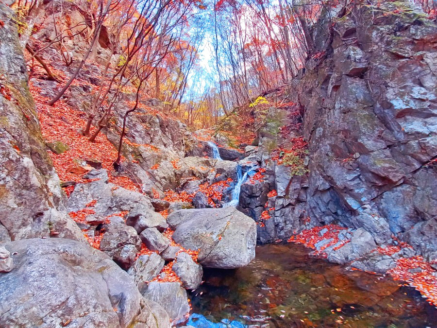 세럼폭포 가는 길에 자생식물관찰원이 있는데, 그곳 단풍이 아주 곱다. 노란 은행잎도 수북이 떨어져서 가을 느낌이 제대로 난다. 단풍 포토존이라 이름 붙여 본다. 거기서 세럼폭포까지는 1.5km, 가파른 오름길 없이 평탄한 길이라서 걷기가 좋다. 그래도 숨이 차게 땀을 빼면서 걸으니 곧 도착한다. 세럼폭포에서 흘러내리는 계곡에 나무다리가 있고 비로봉과 세럼폭포를 가리키는 이정표가 있다. 세럼폭포는 작은 폭포 2개가 위쪽에서 중간쯤에서 흐른다. 폭포를 배경으로 기념샷을 남기고 하산을 서두른다.
