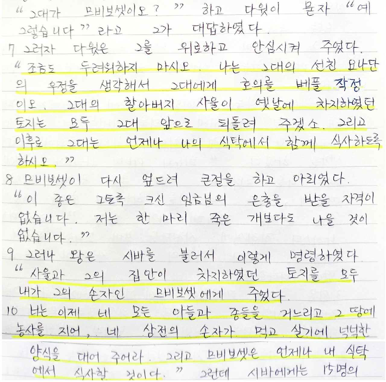 다윗과 요나단의 우정, 다윗의 므비보셋에 대한 대우 등이 가슴을 훈훈하게 하는 부분이다. 이런 우정과 사랑이 있는 세상은 얼마나 아름다울까? 복수에 복수를 거듭하는 세상 드라마와 영화, 소설 등에서는 보기 어려운, 오직 성경 만이 가지고 있는 하나님의 법칙이라고밖에 말할 수 없는 이야기가 아니겠는가? 이래서 날마다 성경을 쓰는 재미가 있다. 혼탁한 세상 한가운데 살고 있어도 마음이 비로소 화안해지는 미담을 만날 수 있기 때문이다.