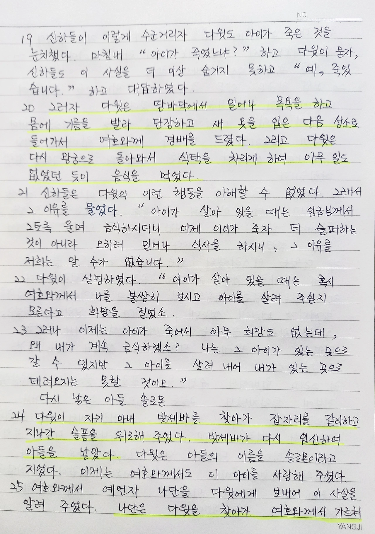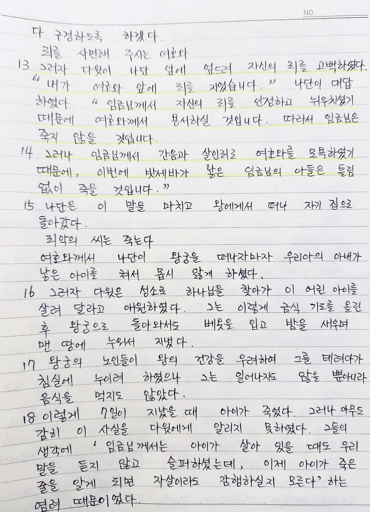 한 가지 더 다윗은 밧세바가 낳은 첫 번째 아들이 죽자 음식도 먹고 의복을 갖춰 입고 하나님을 경배했다. 죗값을 받고 아들이 죽었는데, 하나님의 심판이 정당했음을 시인하는 부분이라고 할 수 있겠다. 이것이 다윗의 훌륭한 점이다. 그래서 하나님은 다윗을 마음에 들어 하셨으리라 짐작을 해본다.