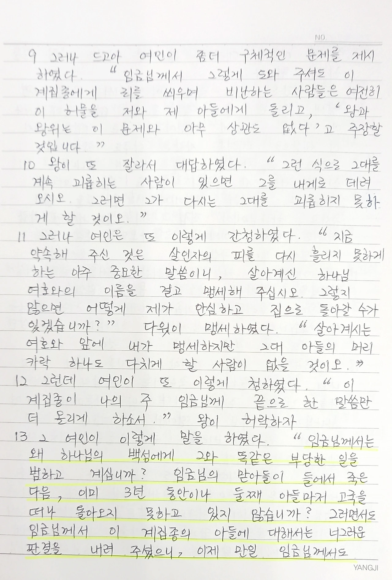 다윗왕은 걱정 말라고 한다. 여인의 살인자 아들이 죽지 않도록 하겠다는 것이다. 그러자 드고아 여인은 다시 말한다.