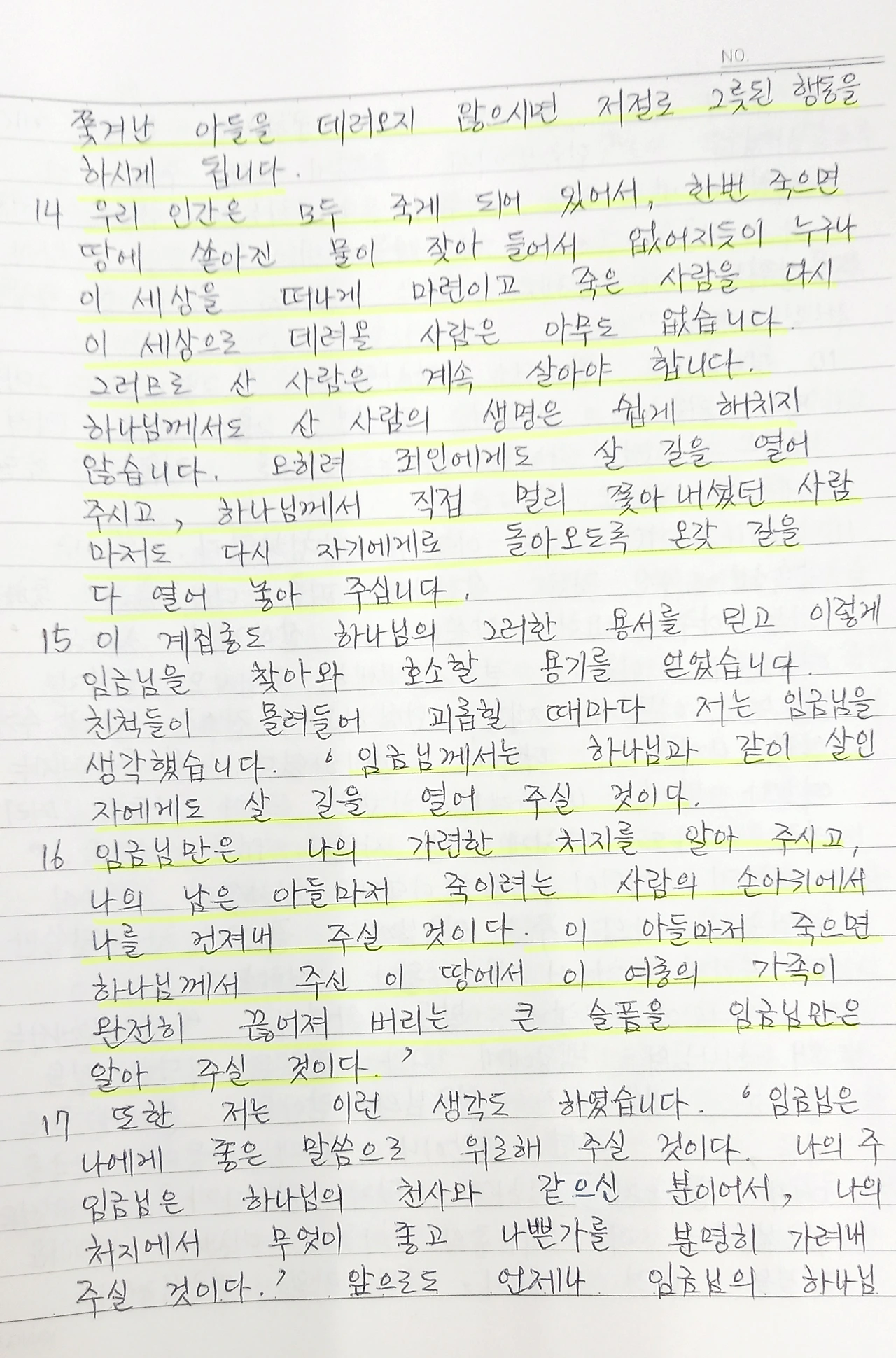 "사람은 모두 죽는데 산 사람은 살아야 합니다. 하나님께서 죄인에게도 살 길을 열어주시는 것처럼 임금님께서는 살인자에게도 살 길을 열어주십니다."