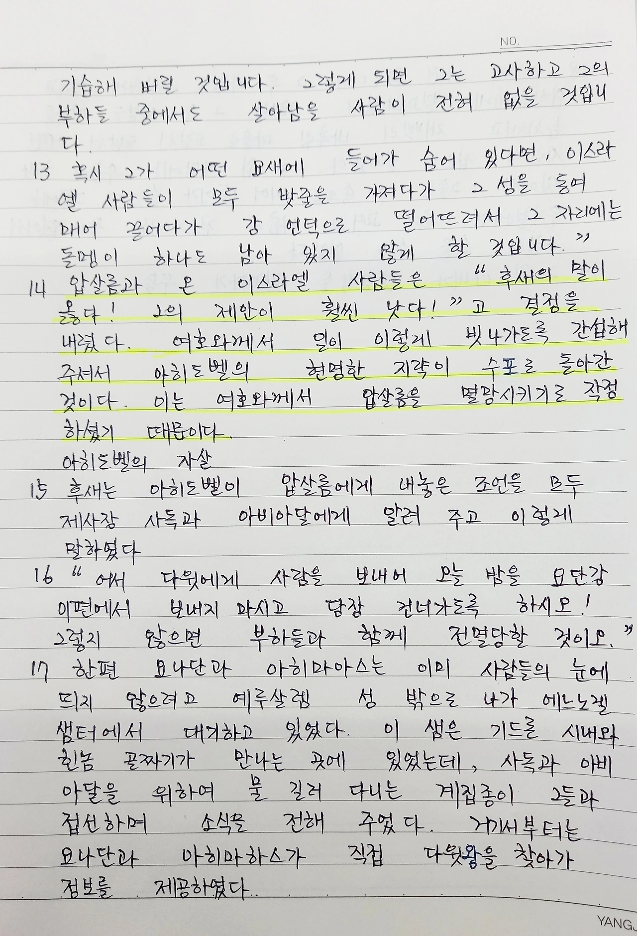 다윗은 피신을 하고 압살롬은 다윗의 후궁들과 대낮에 옥상에서 동침을 하고 이제 도망가는 다윗을 추격해서 잡아서 죽이기만 하면 '반역하여 왕 되기' 프로젝트는 끝나는 것 같다. 그러나 일이 그렇게 호락호락 끝나는 게 아니다.