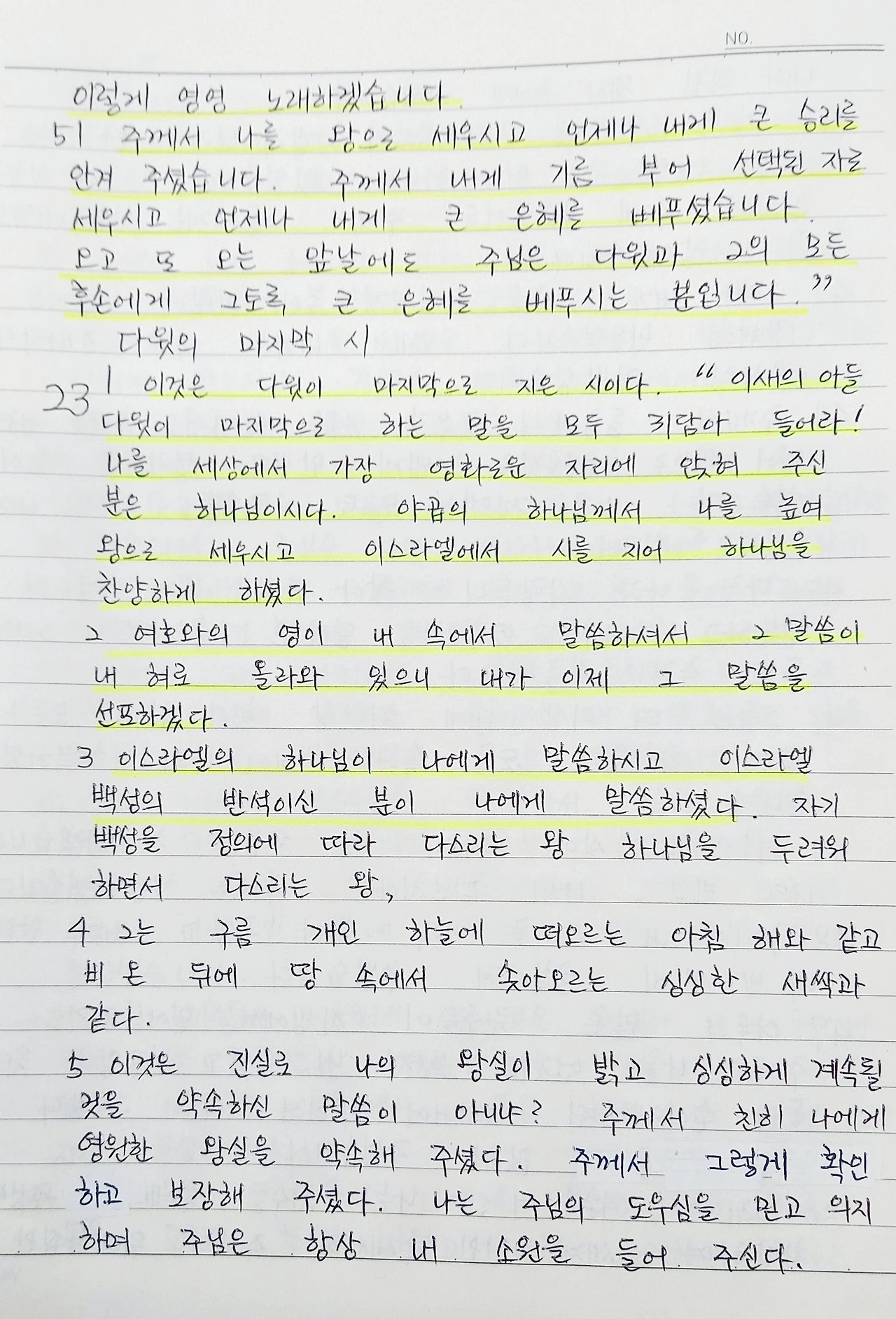 다윗의 마지막 시는 다윗을 가장 영화롭게 하신 분이 여호와 하나님이심은 찬양하는 내용이다.우리가 인생 끝날에 나를 잘되게 하신 분은 바로 하나님이라고 고백할 수 있으면 얼마나 좋으랴! 아니 지금의 나를 있게 한 건 바로 당신이라고, 너라고, 그렇게 말할 수 있다면 그래도 비교적 잘 살아왔다고 할 수 있을 것이다. 거기다가 그 사람이 하나가 아니고 여러 명이라면 그보다 더 좋을 수는 없을 것이다