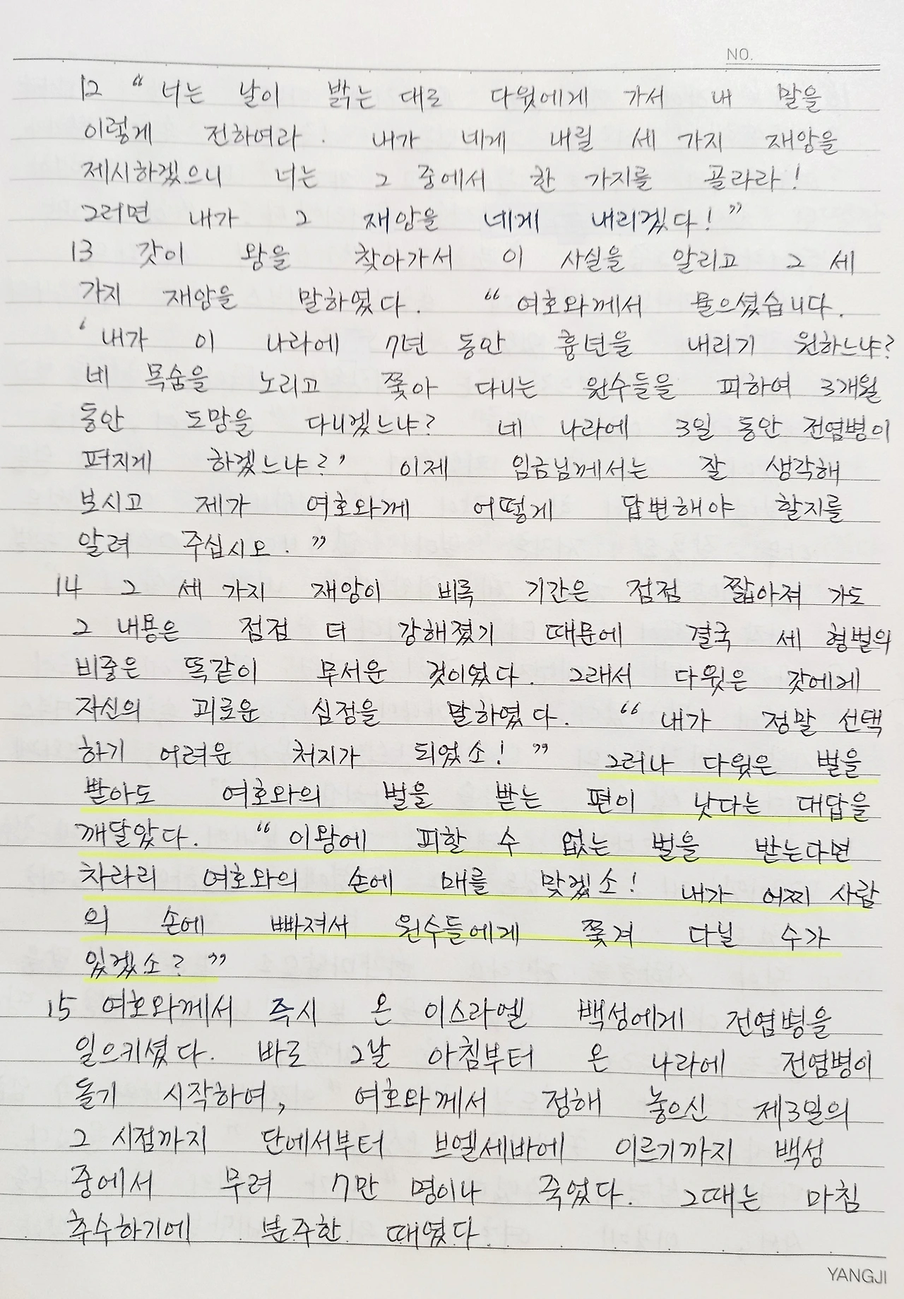 그래서 다윗은 3일 동안 전염병을 선택한다. 7년 동안 흉년, 배고파보아서 싫다. 3개월 동안 도망 다니는 것, 해봐서 잘 안다. 생각만 해도 진절머리가 난다. 말은 사람에게 당하는 것보다 여호와께 매를 맞는 게 더 낫다고 해서 3일 전염병을 택하지만, 윗이 경험해보지 않은 게 전염병이라 그 실상을 제대로 알지 못한 것이다. 사람들이 전염병으로 7만 명이나 죽는다.