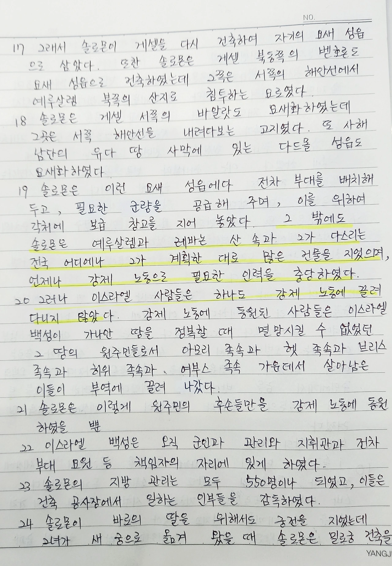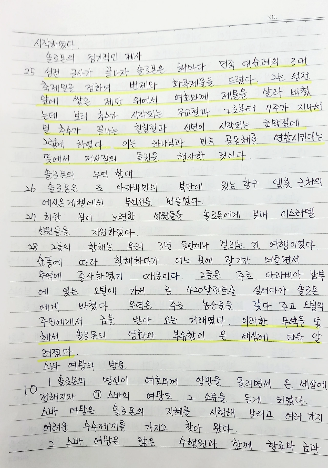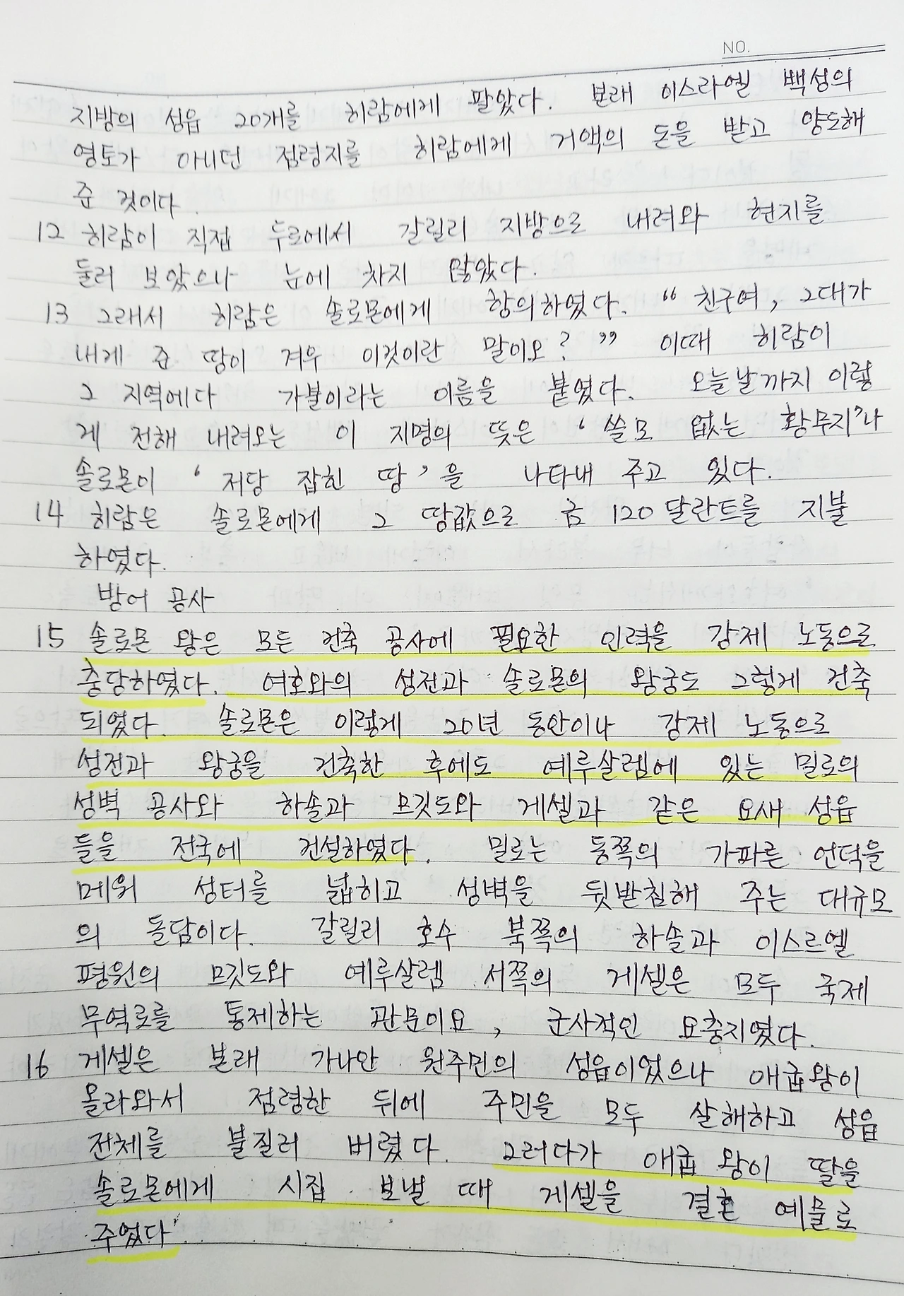 수많은 건축을 하면서 강제노동을 동원한다. 자기 백성인 이스라엘 백성들은 관리를 시키고, 가나안 땅의 원주민인 이방민족들을 강제노동을 시킨다. 자국민 우선주의가 오늘날에 생긴 게 아니라 벌써 솔로몬 시대부터 있어 왔던 것이다. 어차피 정복한 민족이기에 똑같이 대우를 해주었으면 얼마나 좋았을까 생각을 해본다. 골이 깊은 인종주의가 오늘날에도 그치지 않는 전쟁을 일으키고 있다.