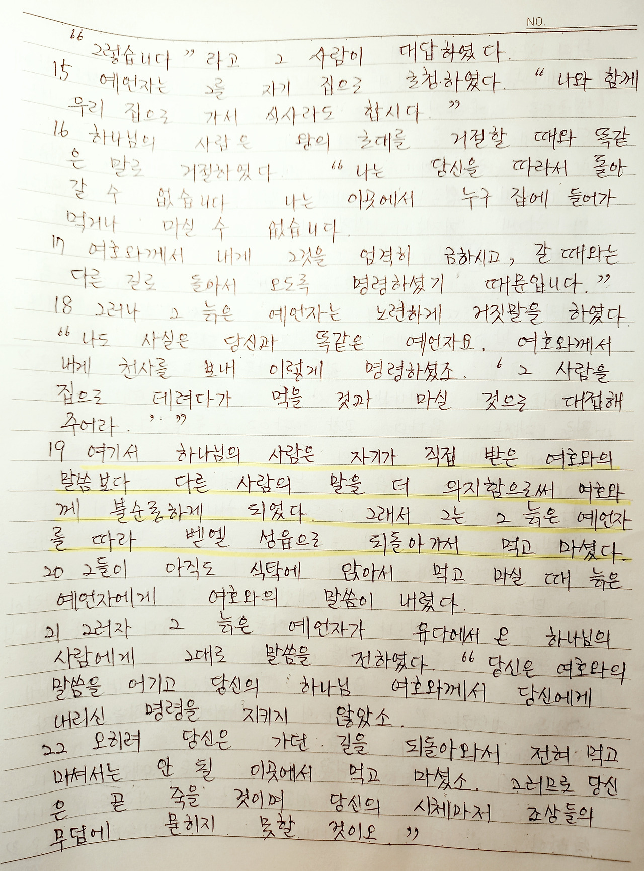 "여기서 하나님의 사람은 자기가 직접 받은 여호와의 말씀보다도 다른 사람의 말을 더 의지함으로써 여호와께 불순종하게 되었다." (현대어성경 왕상 13:19 앞부분)