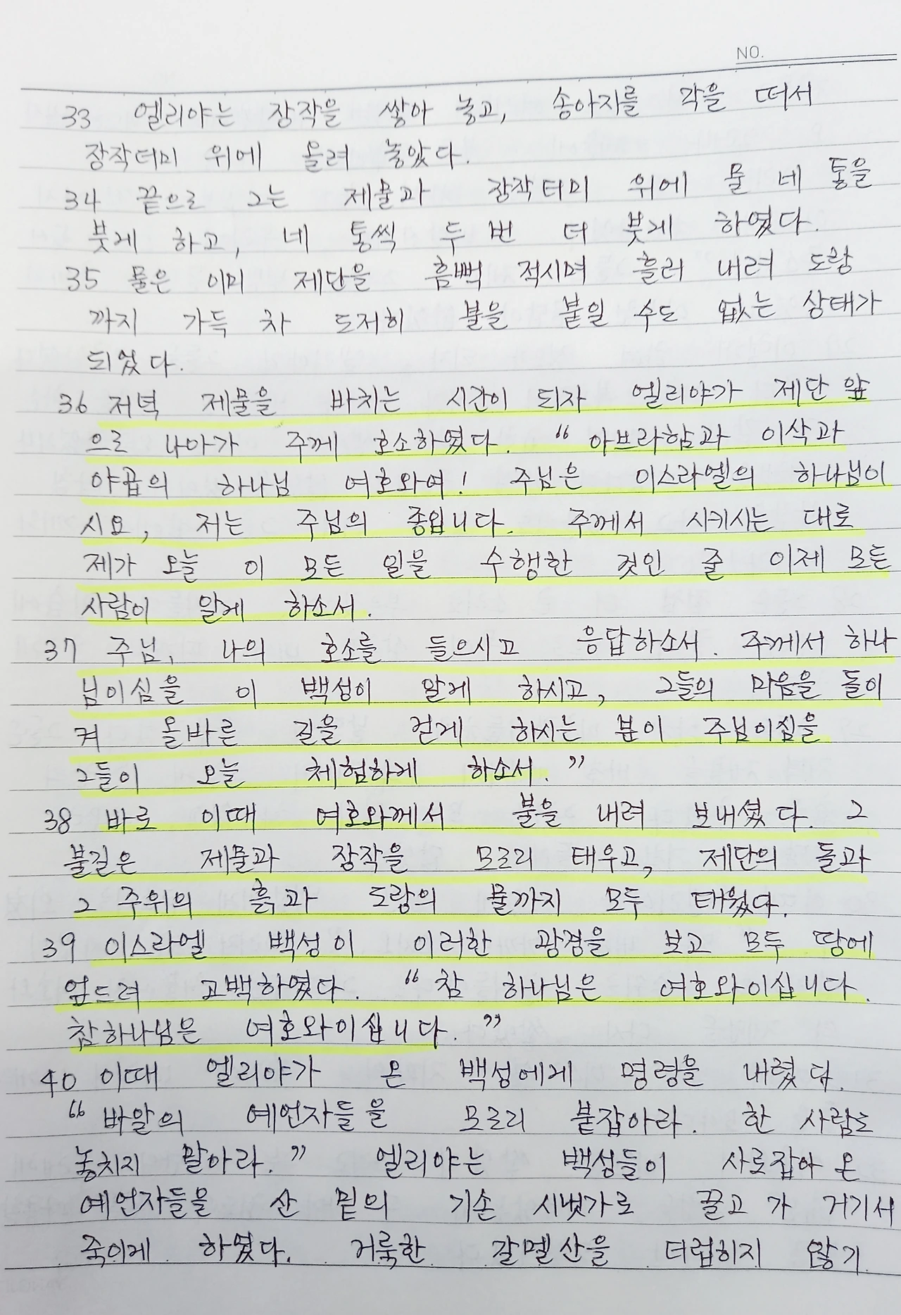 그러자 엘리야 선지자가 도랑에 물을 흘러넘치도록 붓고 황소를 잡아 놓고 하나님께 제사를 드린다. 곧 제물에 불이 붙어서 제물을 모두 태워버린다. 모인 사람들이 외친다.