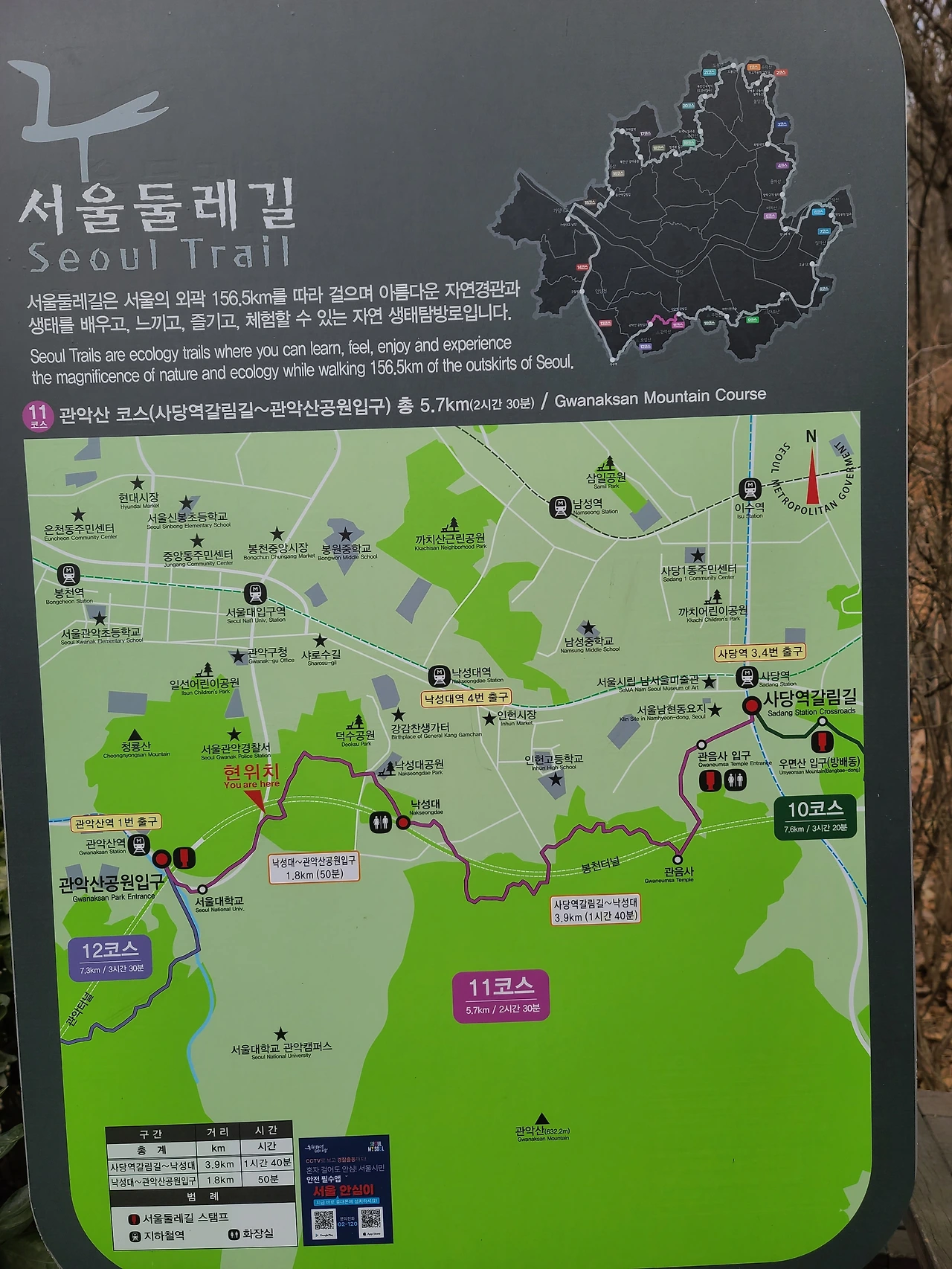 사당역에서 시작된 산행은 걷기 좋은 산길을 걸어 강감찬 장군의 낙성대로 내려와 추억의 서울대 정문(대학 다닐 때 데이트하면서 자주 드나들었던 곳이다)을 지나 도란도란길을 걸어 관악산역에서 마무리하였다. 세브란스님은 화장실 다녀오다 놓쳐서 바로 관악산역에서 만나기로 했고 추무치님은 좀더 오래 산행하고 싶다며 3만원 뒤풀이비 후원해주시고 딴길로 가셨다.